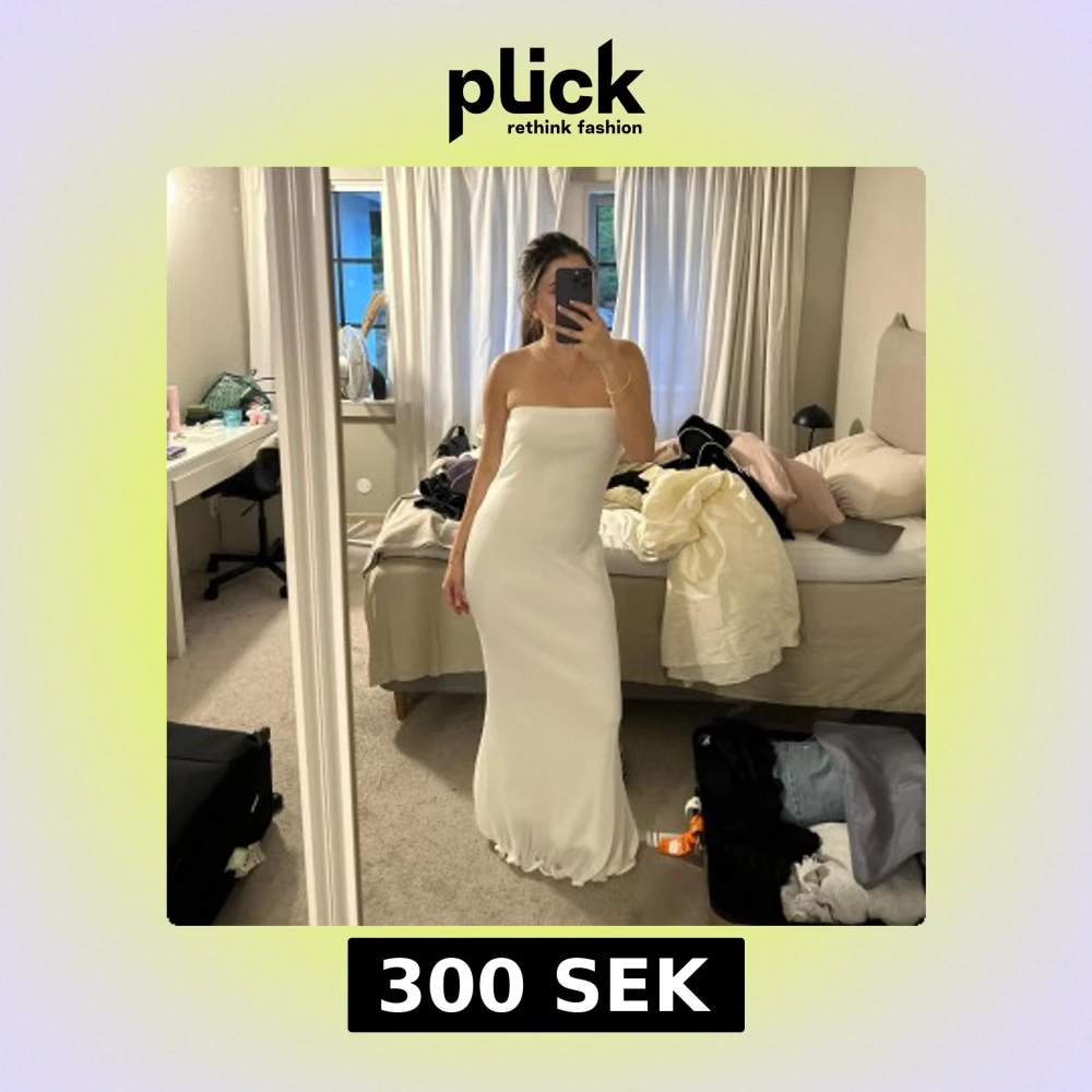 Säljer en stilren vit långklänning med axelbandslös design och lätt ribbad struktur. Klänningen har en tight passform upptill och faller rakt ner med en snygg drapering längst ner. Perfekt för dig som gillar minimalistisk och elegant stil.
