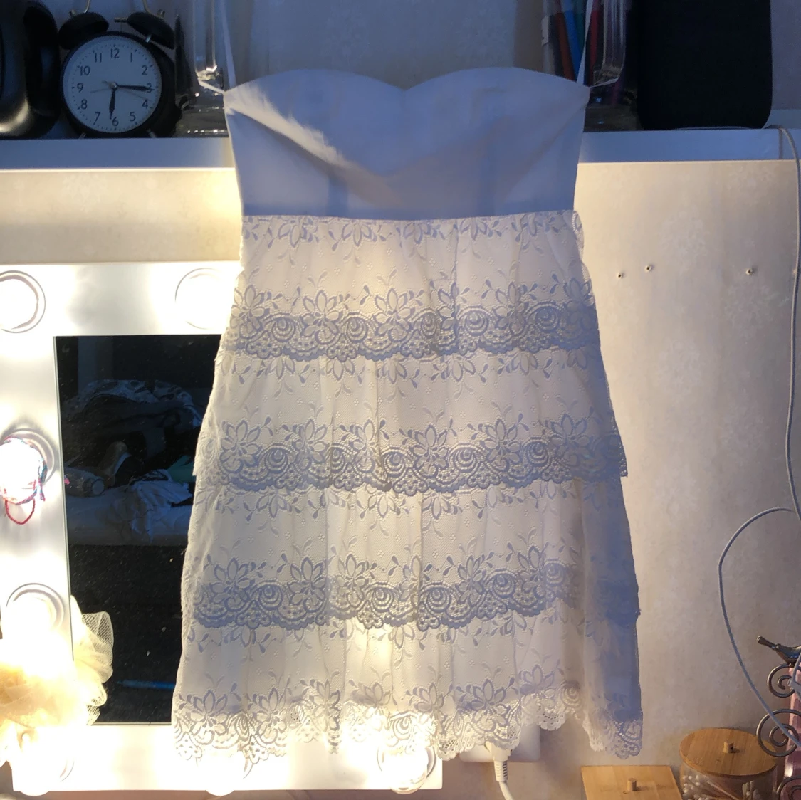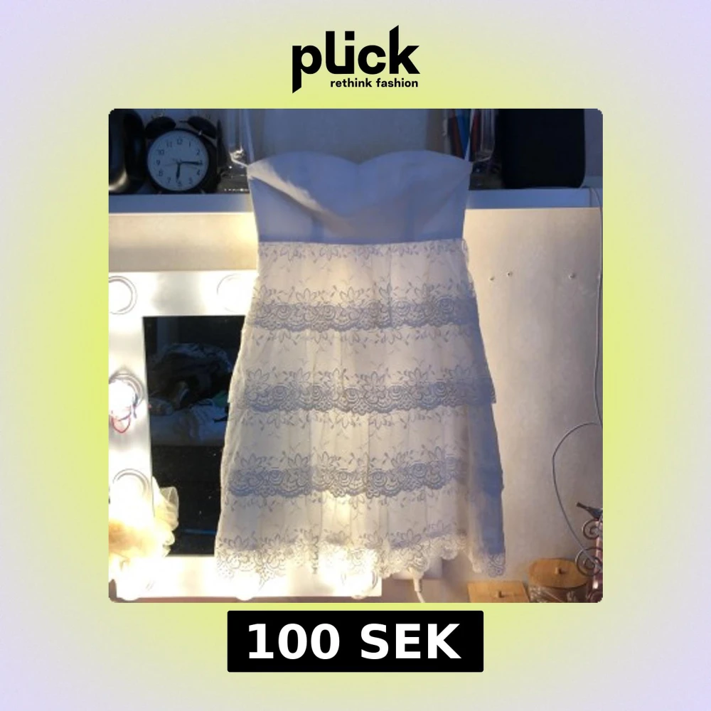 Superfin vit axelbandslös klänning med flera lager spets och blommigt mönster. Kjolen är kort och har volangdetaljer som ger en romantisk vibe. Perfekt för student eller sommarens alla tillfällen. Sitter snyggt med en slim passform och har en feminin look.