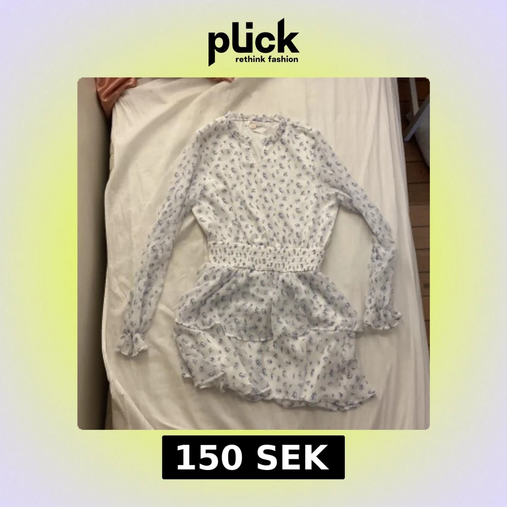 Söt vit klänning från Gina Tricot med små blå blommor, långärmad och med markerad midja. Klänningen har volangdetaljer på kjolen och är tillverkad i ett lätt och luftigt material. Perfekt för vår och sommar!💕