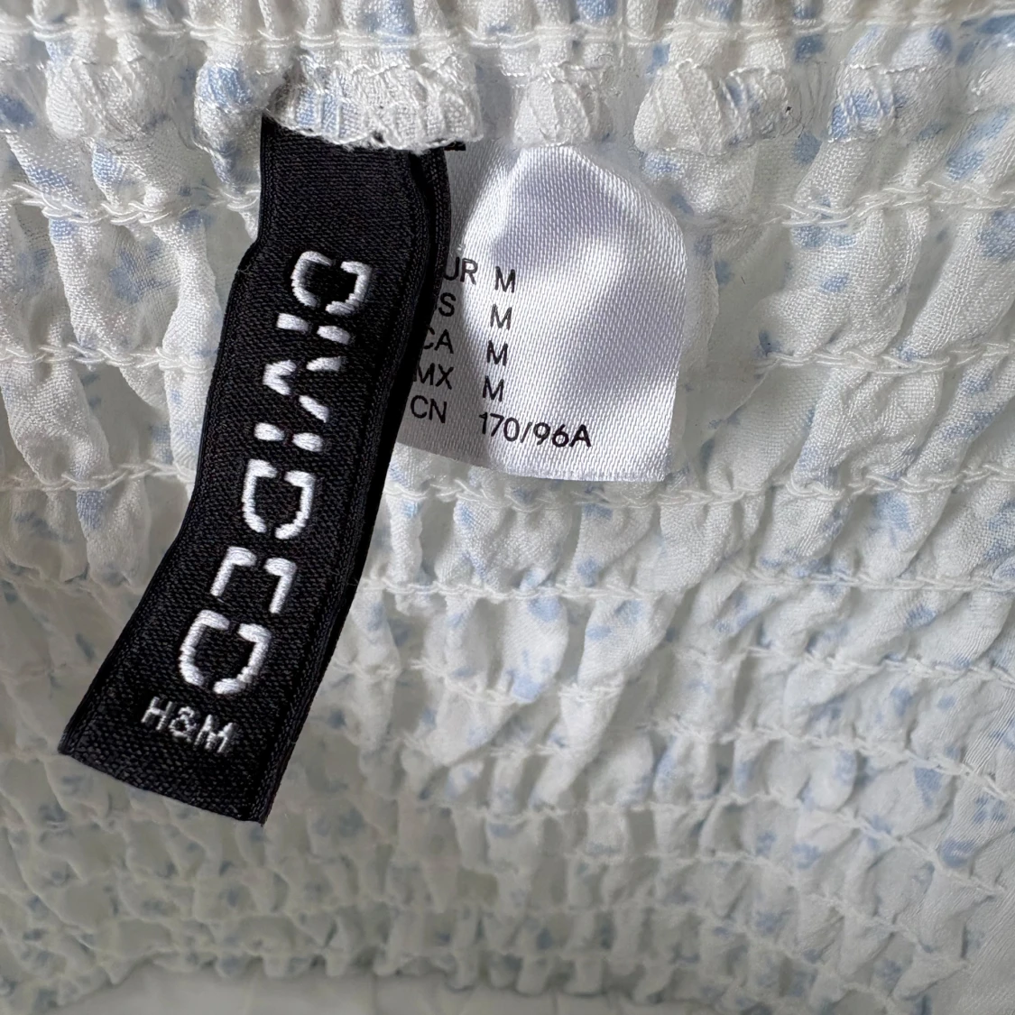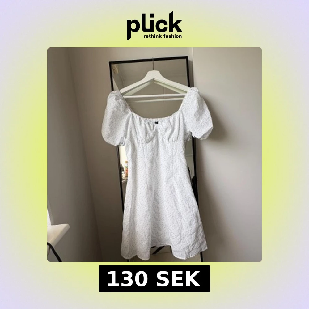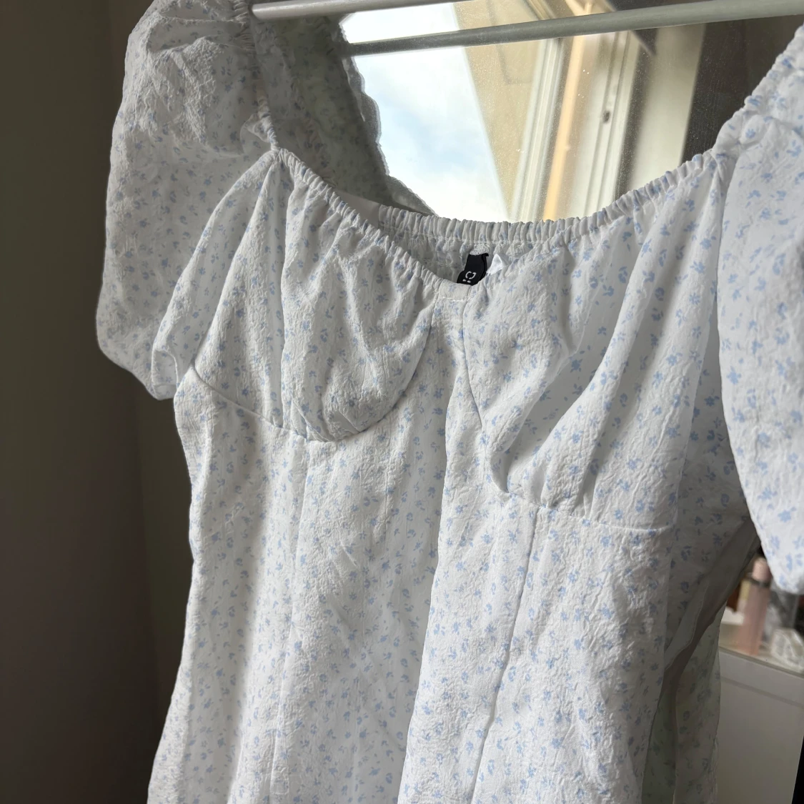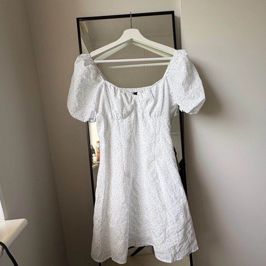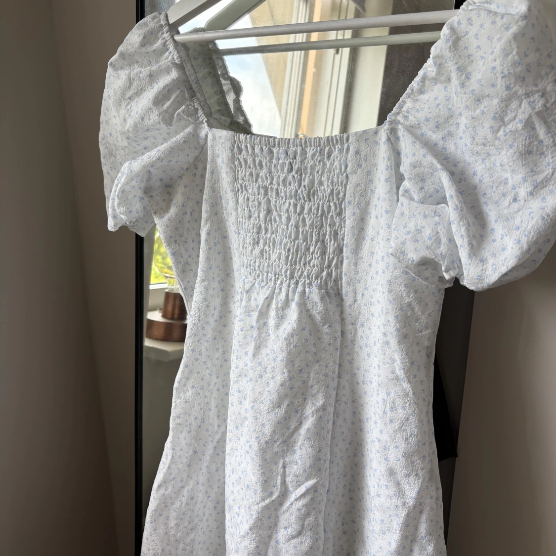 Supersöt vit kortklänning med ljusblått blommönster från H&M Divided. Klänningen har puffiga korta ärmar, smock i ryggen och en söt, lätt v-ringad. Använd 1 gång