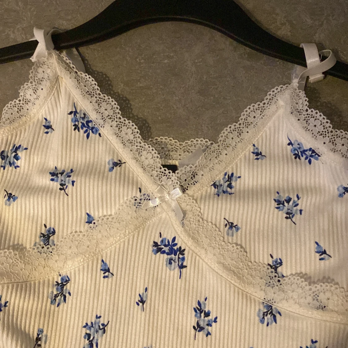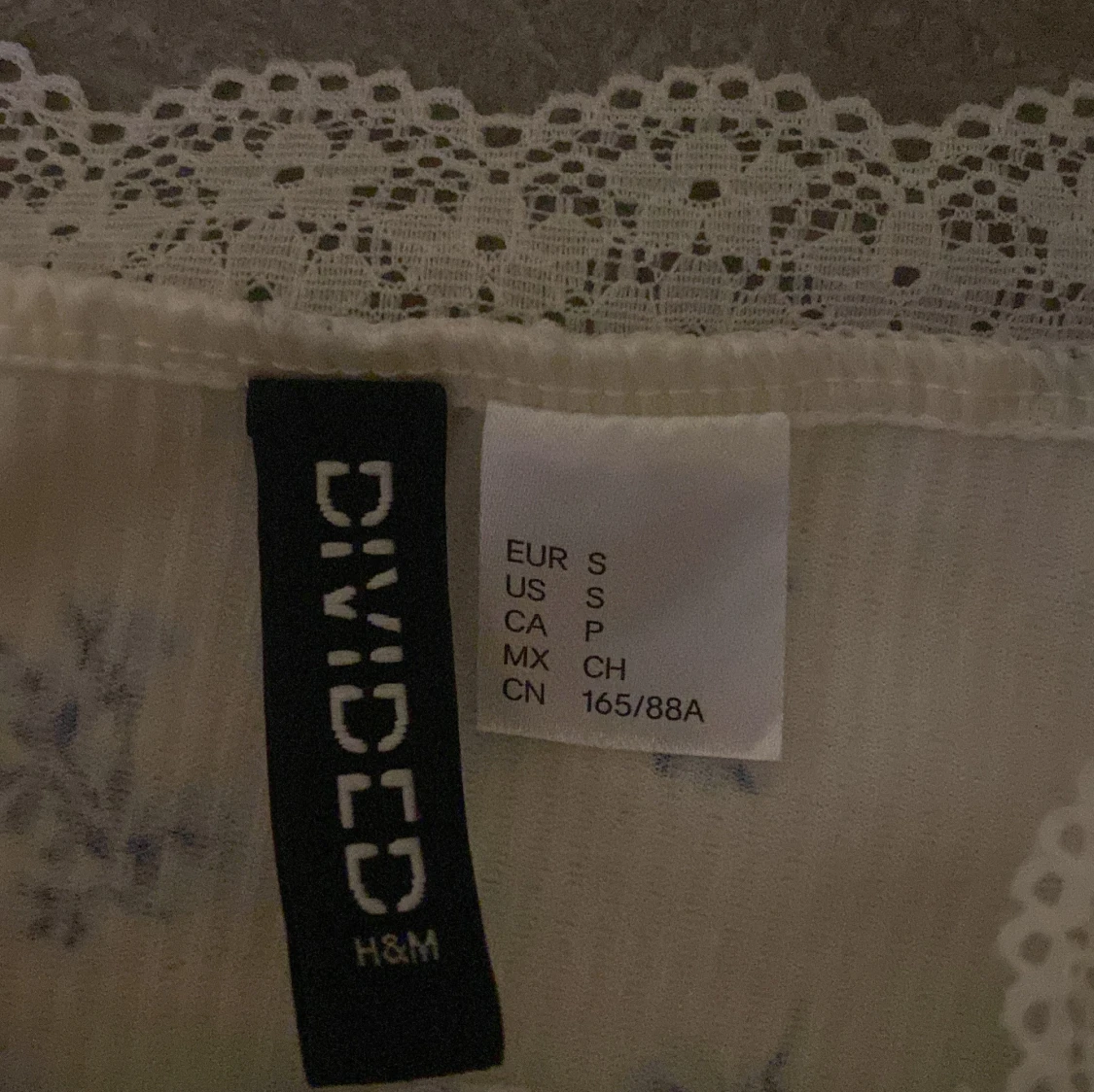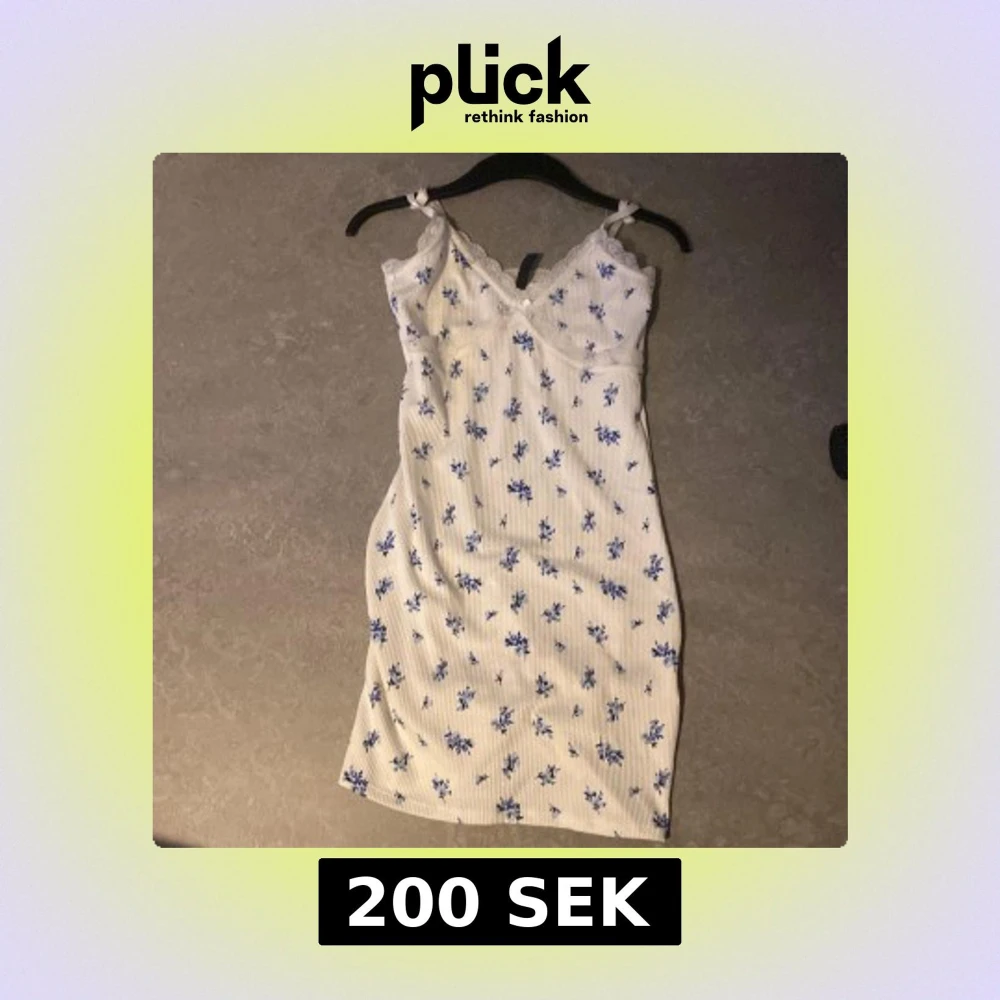 Supersöt vit kortklänning från H&M Divided med blått blommönster och spetsdetaljer vid v-ringad hals🤗Säljer då den aldrig kommit till användning.