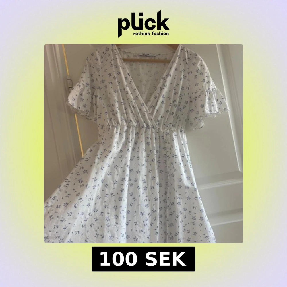 Superfin vit kortklänning från NA-KD med blått blommönster, omlott och v-ringning. Klänningen har korta volangärmar och resår i midjan för en fin passform. Perfekt att ha i sommar!