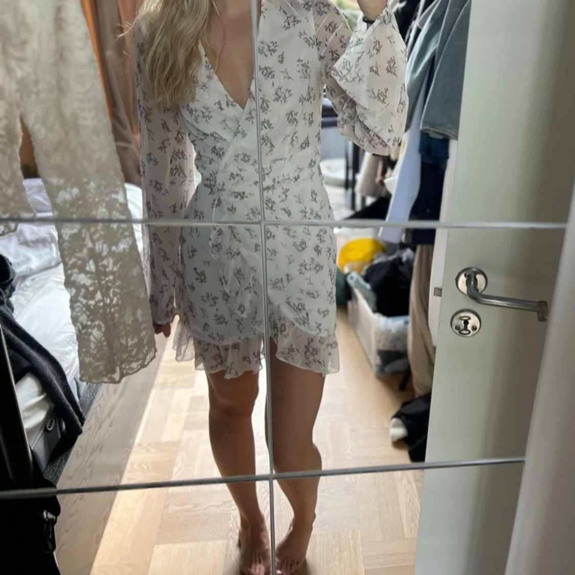Supersöt vit kort omlottklänning med blommigt mönster och volangkant. Långa, transparenta ärmar och knyt i midjan. Perfekt för varma dagar och somriga tillfällen. Lätt och luftig känsla!