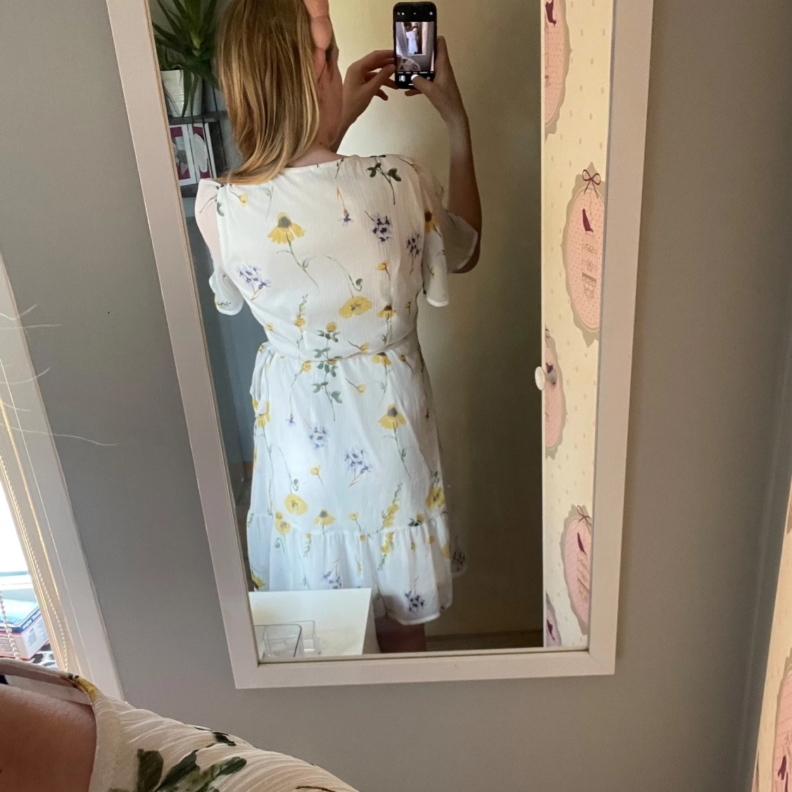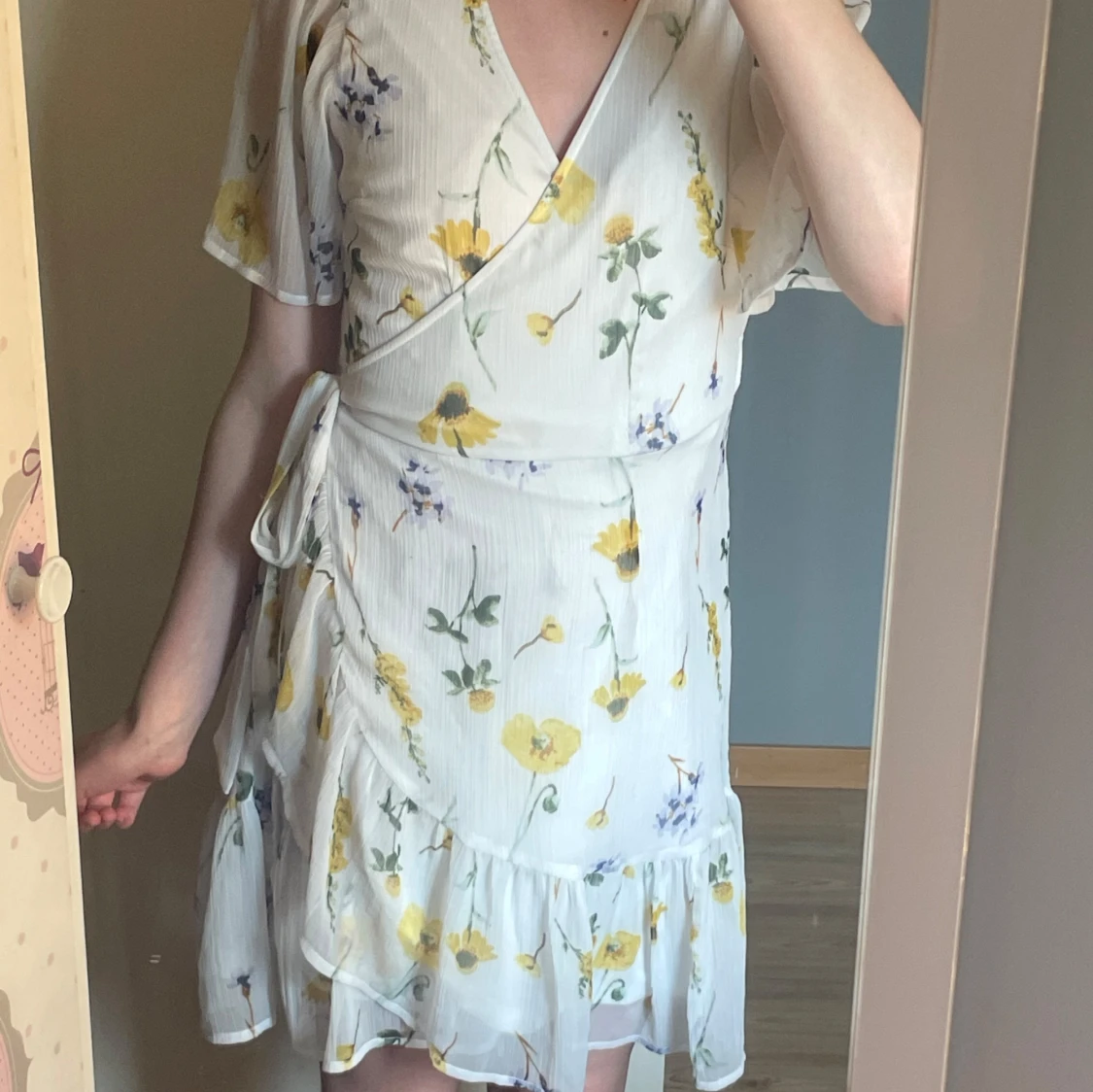 Superfin vit kortklänning med blommigt mönster i gult och blått. Omlottmodell med knyt i midjan, v-ringning och volangkant nertill. Lätt och luftig med korta ärmar, perfekt för varma dagar.