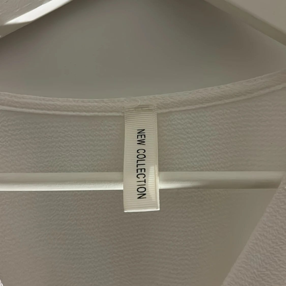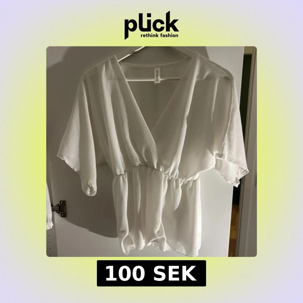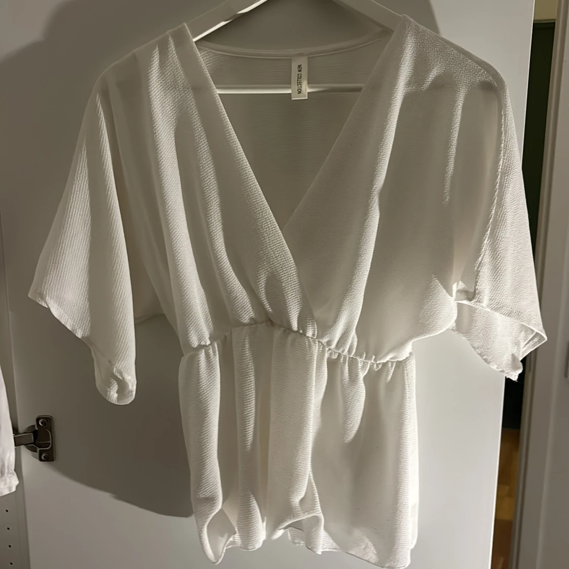 Säljer en vit blus från New Collection med omlott-design och v-ringad hals. Klänningen har korta, vida ärmar och ett resårband i midjan som ger en snygg siluett. Materialet är lätt och har en diskret struktur som känns fräsch och somrig.