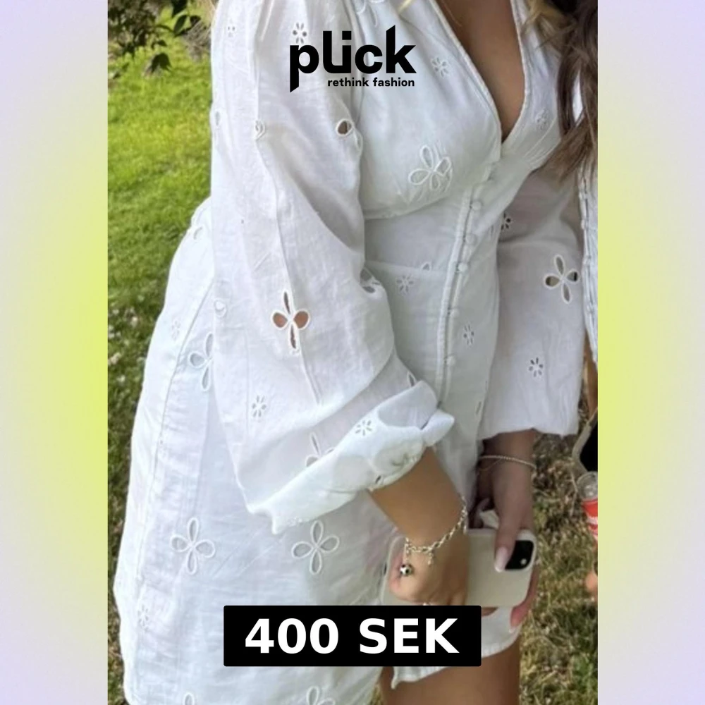 Superfin vit kortklänning från NA-KD med broderade blommor, v-ringning och knappar framtill. Långa ärmar med lätt puff och resår vid handlederna. Perfekt för sommarens alla tillfällen, i luftig bomull som känns fräsch och lätt. Storlek L men jätte liten i storleken passar S/M. Perfekt student klänning🥹