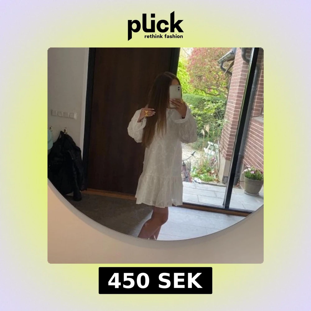 Superfin vit kortklänning med broderade blommor, volang nertill och långa puffärmar. Klänningen har öppen rygg med knytband. Endast använd 1 gång under min konfirmeration så säljer nu vidare den. Klänningen är från NAKD. Nypris är 699. Klänningen är i xxs, och klänningarna är stora i storlekarna.