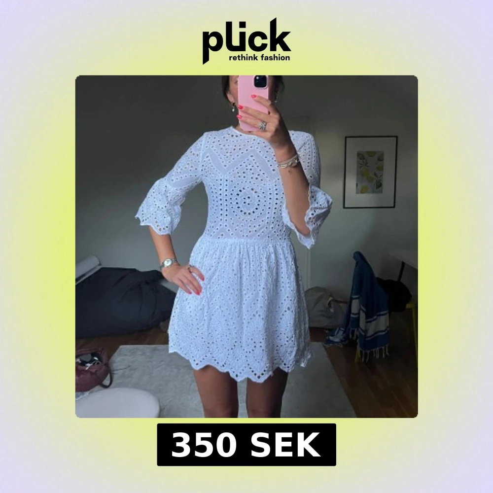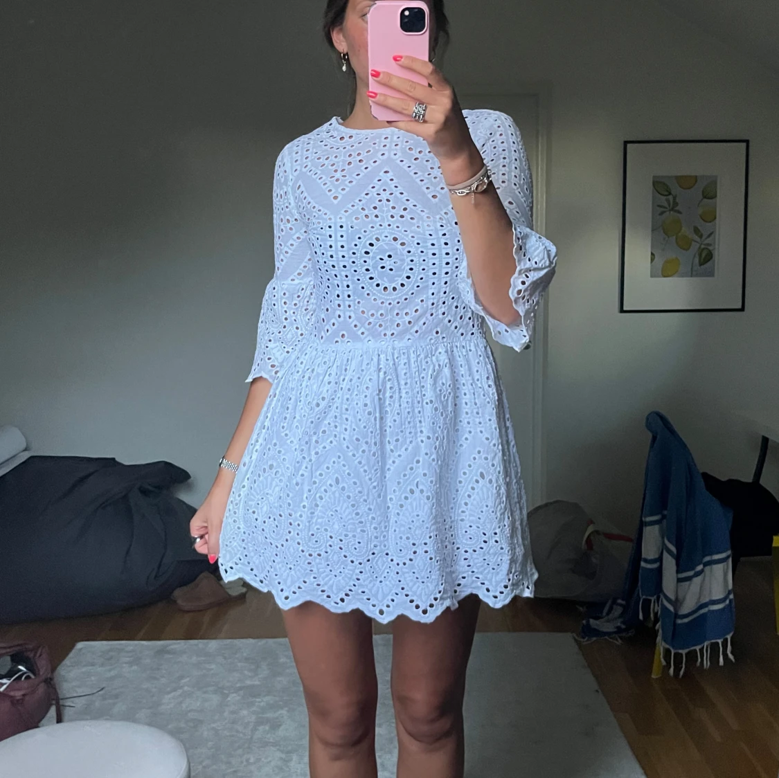 Superfin vit kortklänning med broderade detaljer och hålmönster.