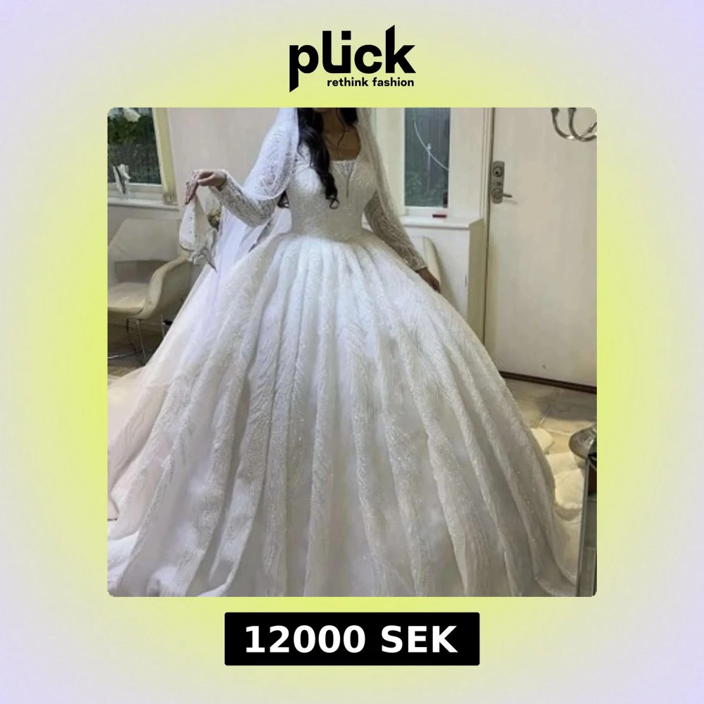 Elegant vit bröllopsklänning med glittrande detaljer och spets. Klänningen har långa ärmar och en vid kjol som ger en klassisk prinsesskänsla. Perfekt för den stora dagen! Behöver kemtvättas så blir den helt perfekt! Den är specialbeställd från Berlin.