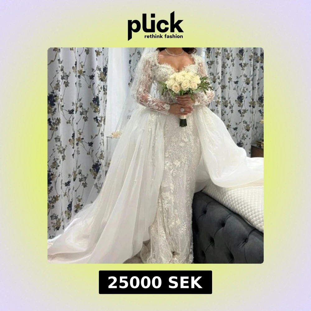 Elegant vit brudklänning med långa spetsärmar och en vacker öppen rygg. Klänningen har en lång släp och är dekorerad med pärlor och broderier. Den har en figurnära passform med en vacker volangdetalj vid midjan.
