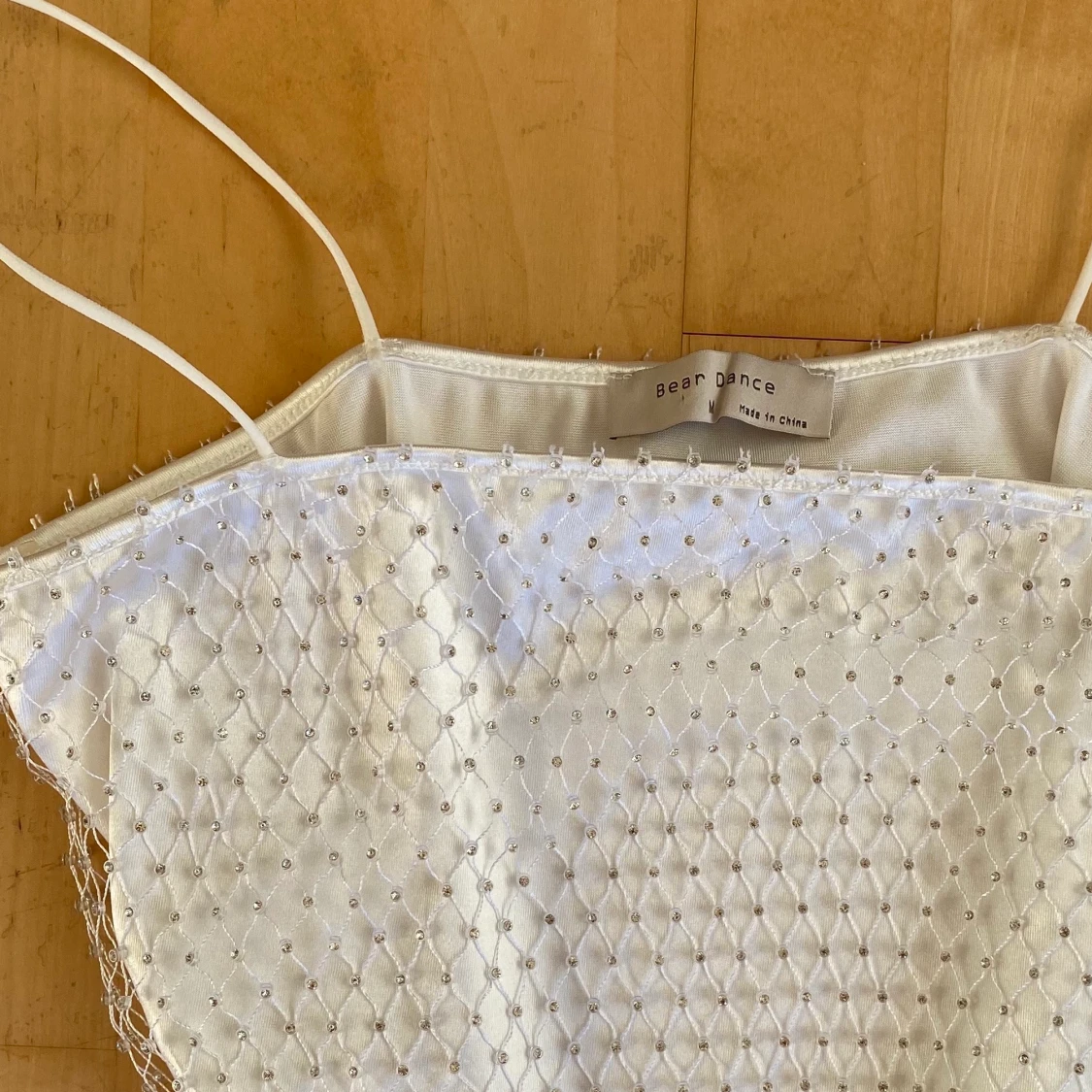 En vit klänning med överliggande nät med ”pärlor” som köptes i USA för många år sedan. Har aldrig använts och är i nytt skick! Det står strl M men är absolut snarare en XS-S… Jag hade tänkt klippa nätet som går nedanför självaste klänningen, skulle nog se bättre ut 😛 frakt ingår!!