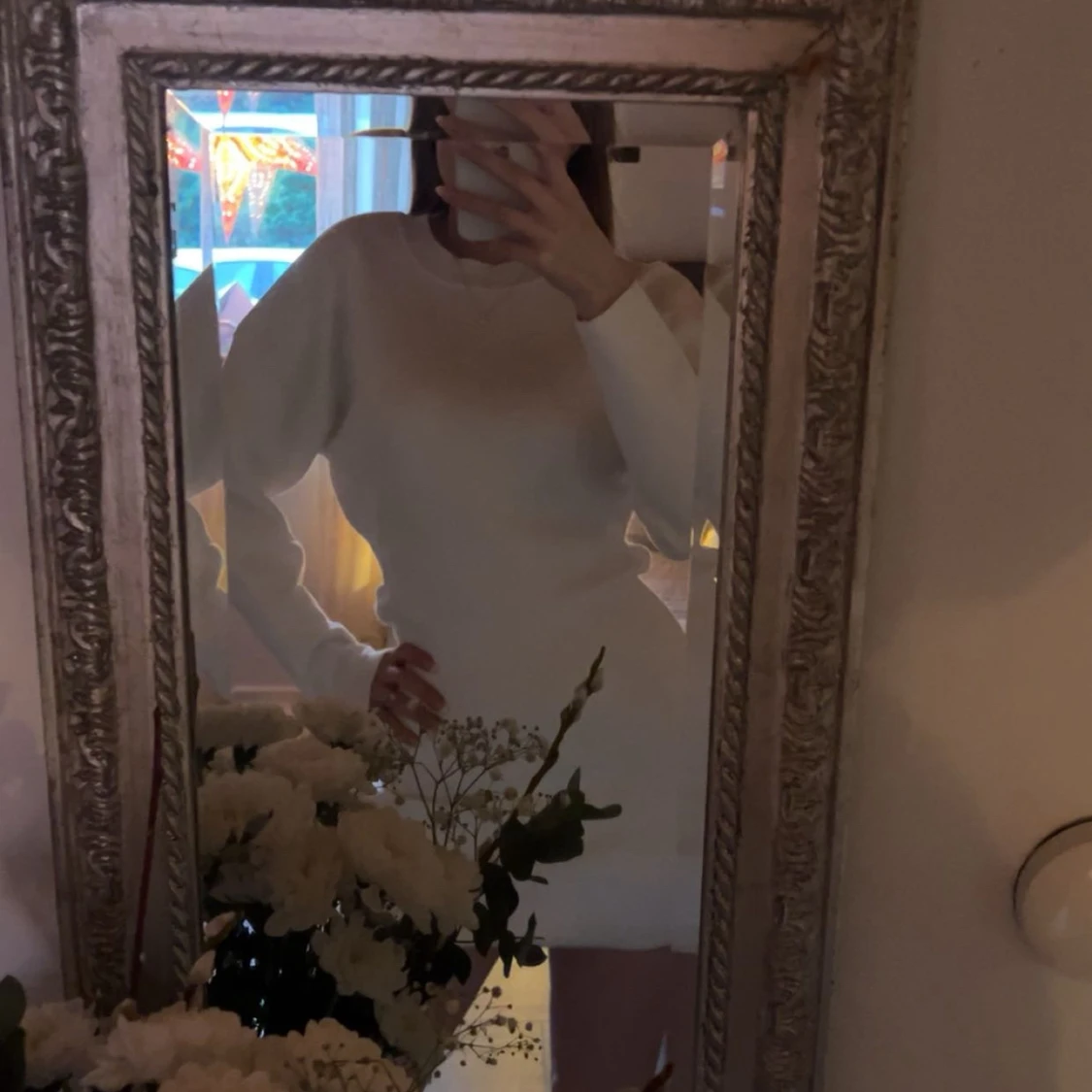 Supersnygg vit kortklänning med lång ärm och rund hals. Klänningen är figurnära och har en stilren, minimalistisk look som passar perfekt när du vill känna dig extra fräsch. Materialet ser ut att vara mjukt och stretchigt, vilket gör den bekväm att bära.