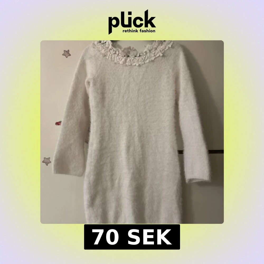 Supermjuk och fluffig vit klänning med långa ärmar och vacker spets med blommor runt halsringningen. Perfekt för dig som gillar en mysig men ändå söt stil. Klänningen är kort och har en enkel, rak passform. Du kan hitta mer på min sida.