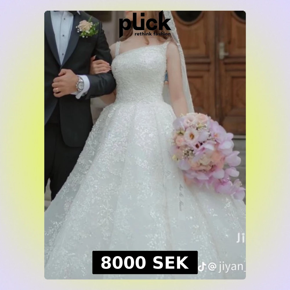 Drömmig vit bröllopsklänning med glittrande detaljer och bred kjol i prinsessmodell. Klänningen har smala axelband, fyrkantig urringning och är ärmlös. Perfekt för dig som vill känna dig som en prinsessa på din stora dag.