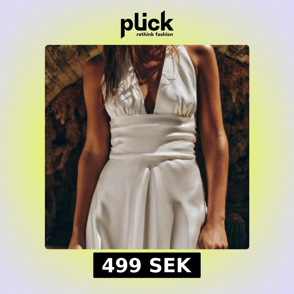 vit halterneck klänning med djup v-ringning och knytbar rosett baktill. Helt i nyskick. Oanvänd då den inte passade mig. Slutsåld helt.