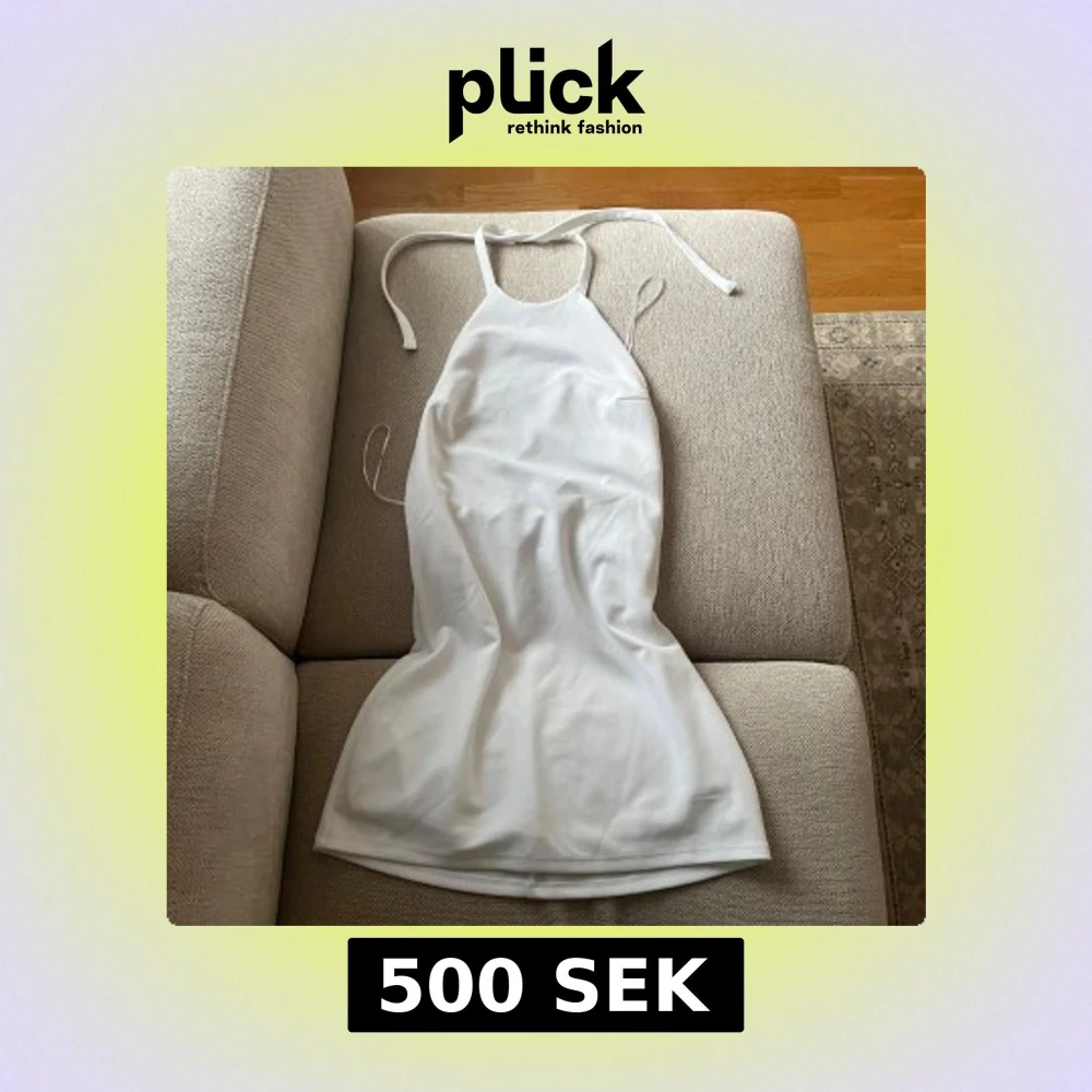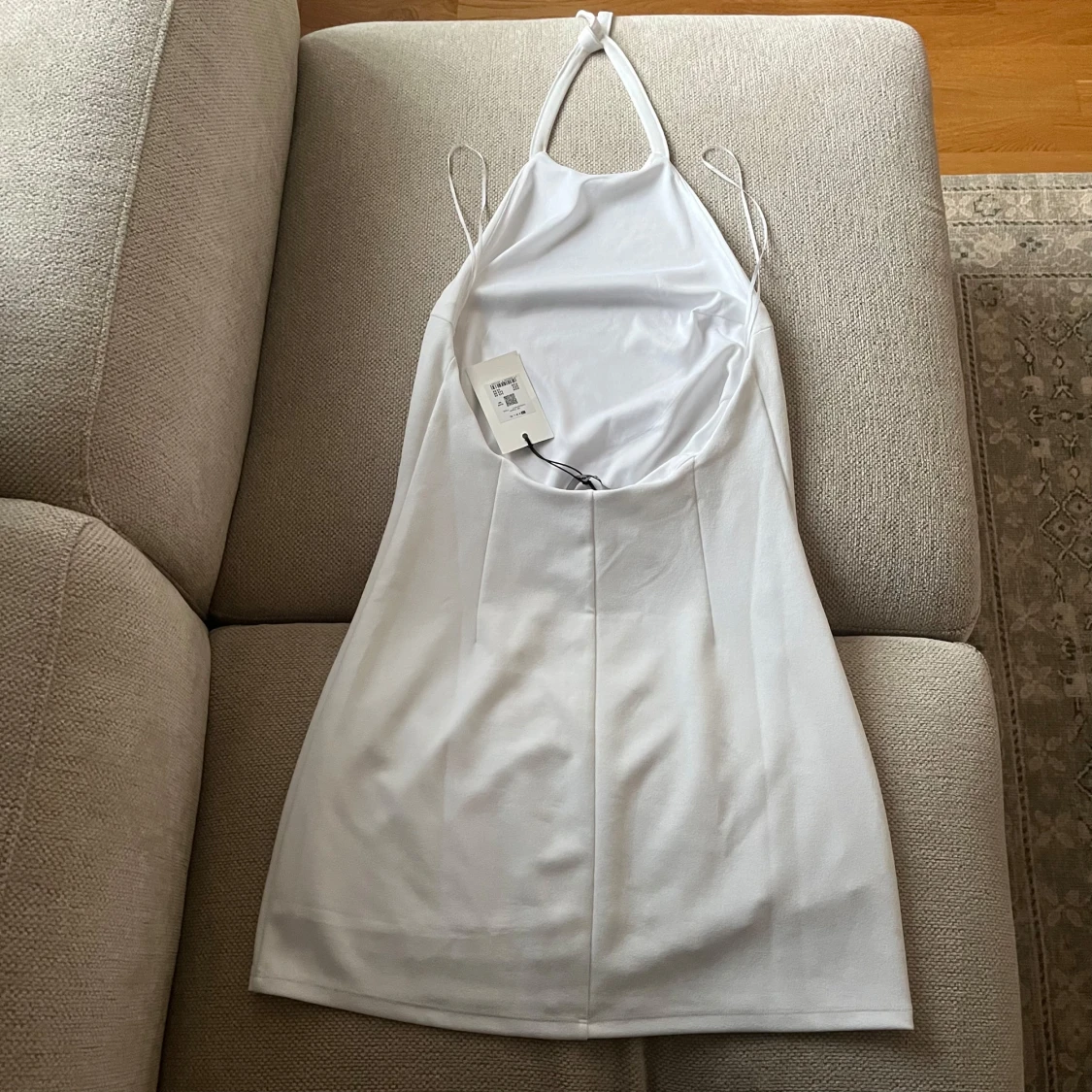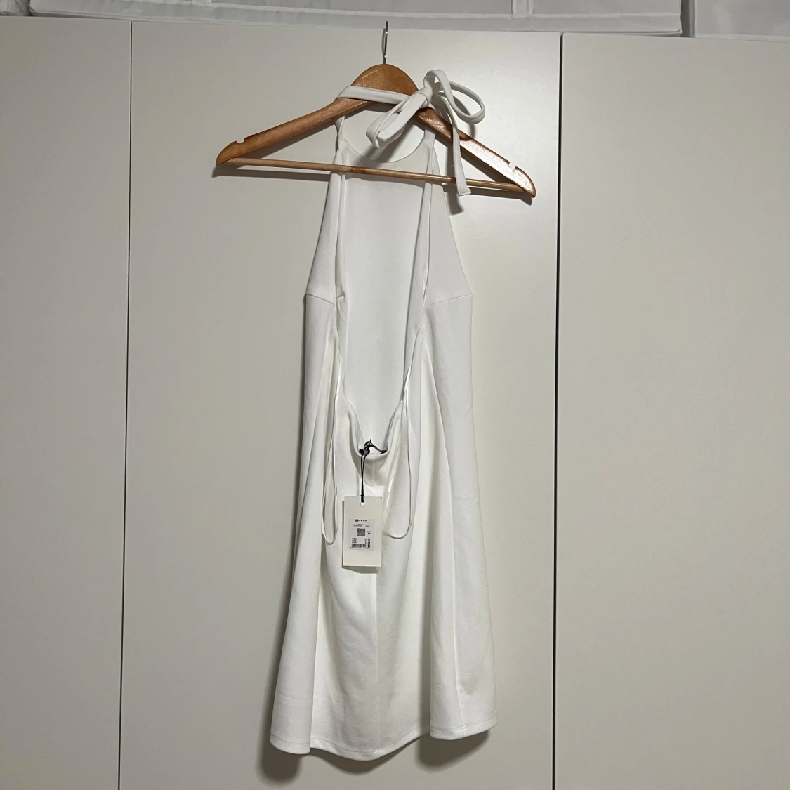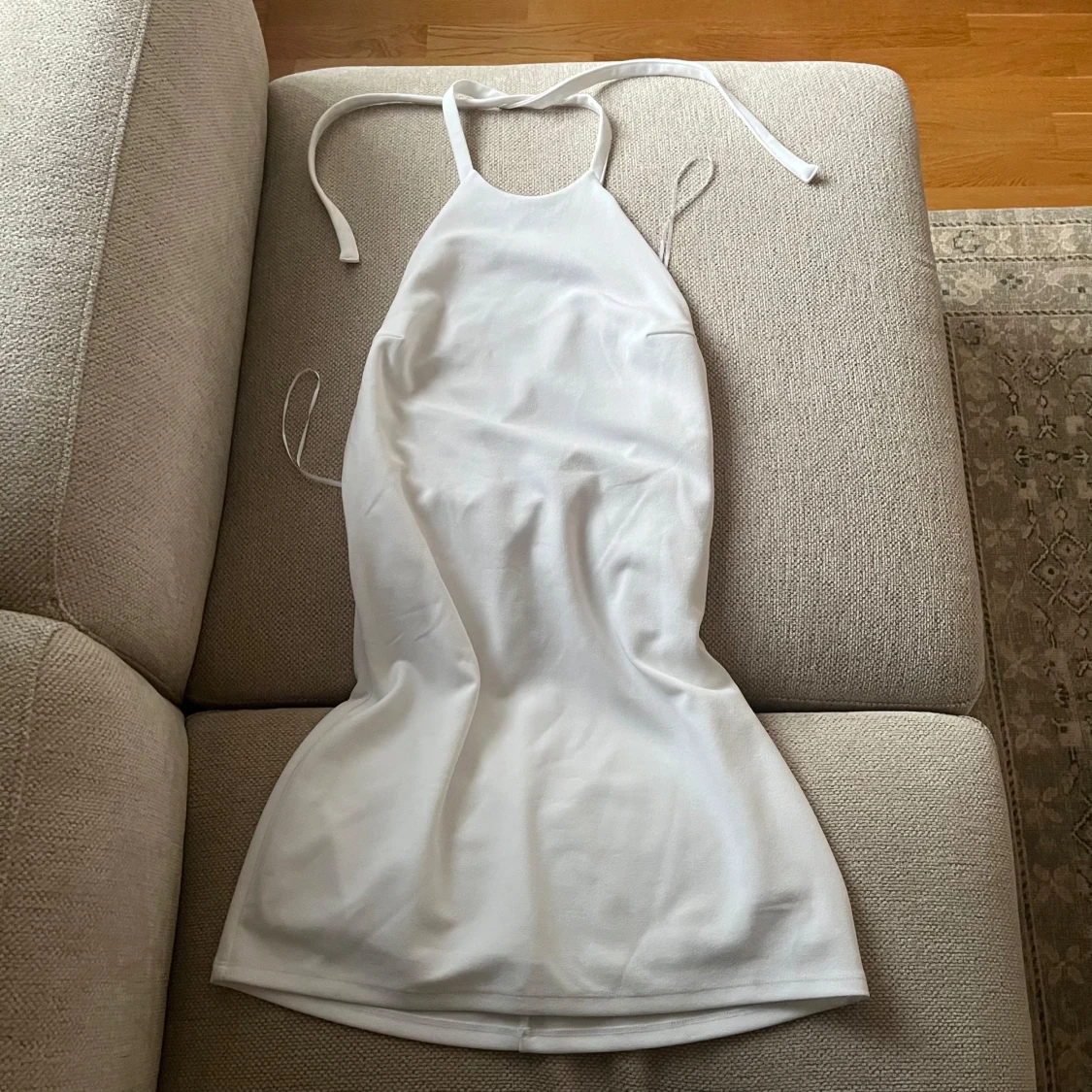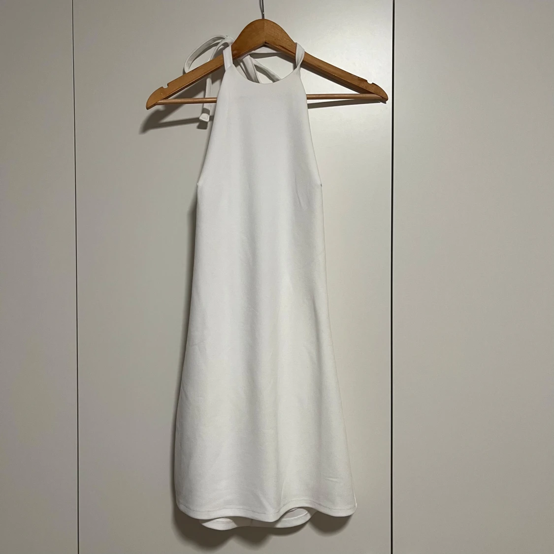 Supersnygg vit kort klänning från BikBok med halterneck och öppen rygg. Klänningen har en lätt A-linjeformad siluett och knytband i nacken. Perfekt för sommarens alla tillfällen. Materialet är mjukt och följsamt, vilket gör den både bekväm och stilren.