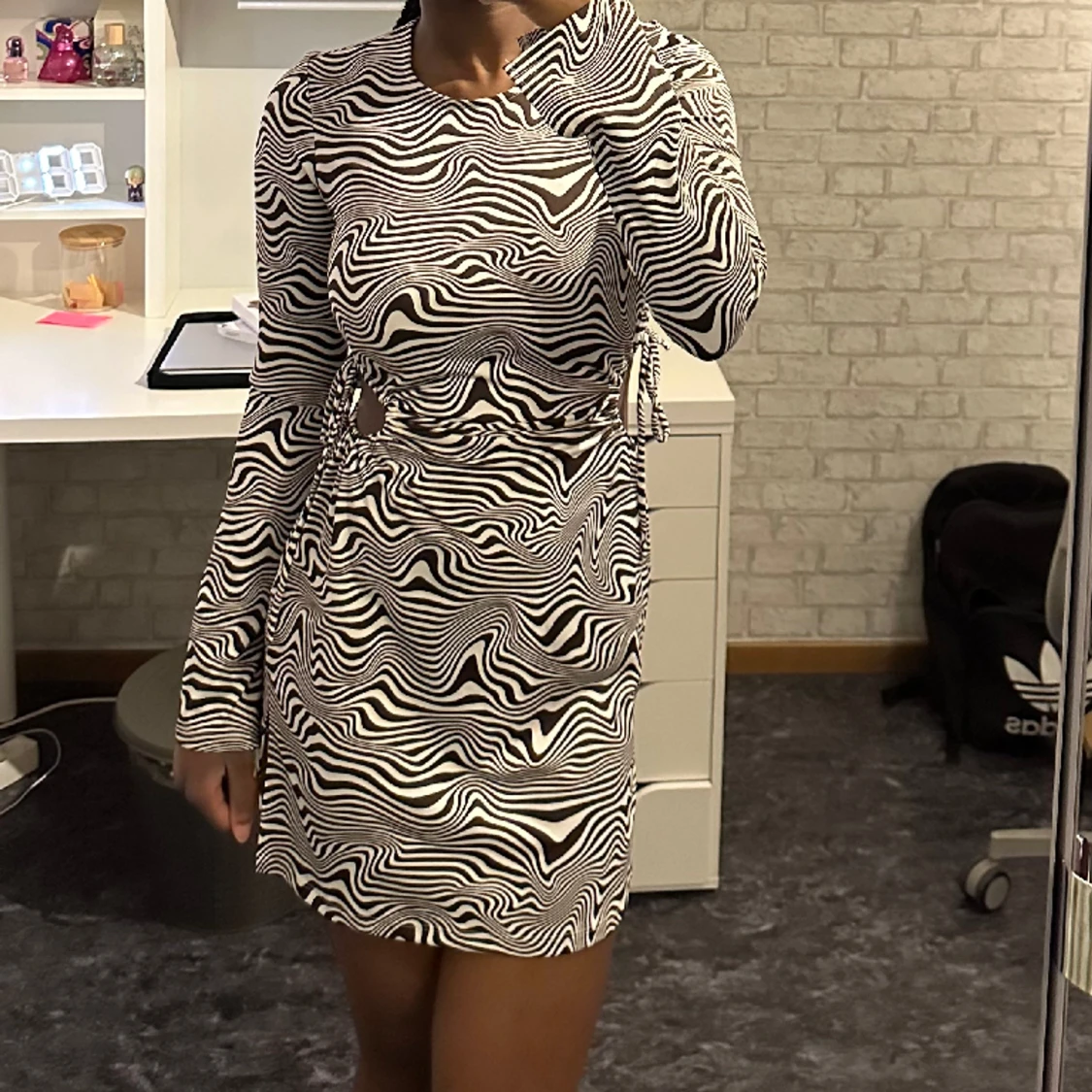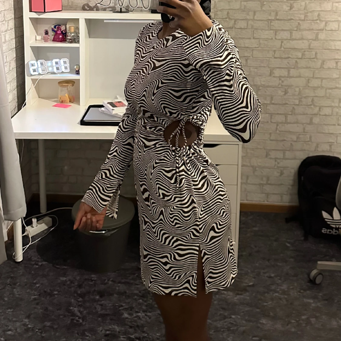 Klänning i coolt mönster med cut outs! Aldrig använd endast testad.