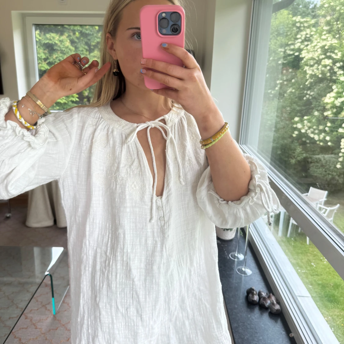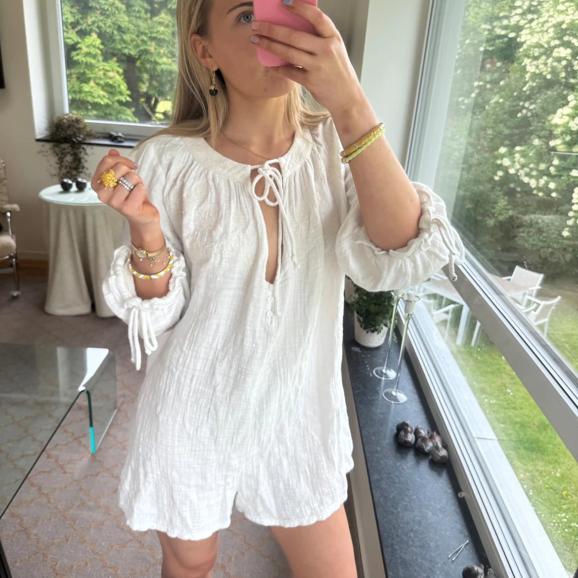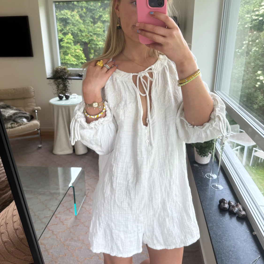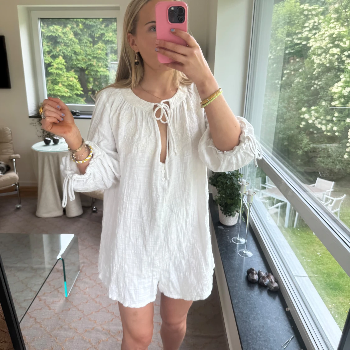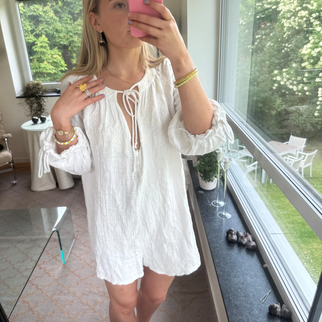 Superfin vit kortklänning i luftig bomull med avslappnad passform. Klänningen har långa ärmar med knyt vid handlederna och en snygg snörning vid halsen. Perfekt för varma dagar och ger en chill vibe.