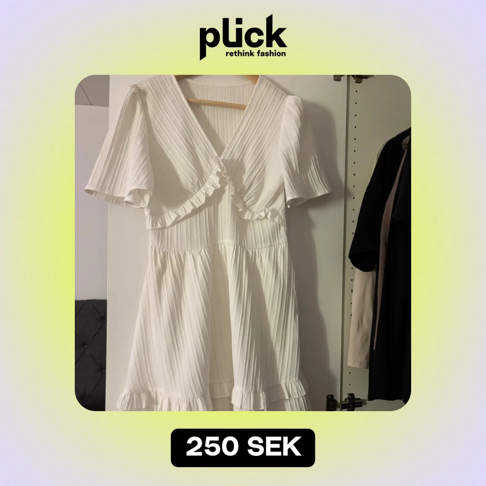 Säljer en superfin vit klänning med volangdetaljer. Den har en v-ringad design och kortärmade ärmar, perfekt för sommarens alla fester. Klänningen är i nyskick, har bara använts en gång och har en luftig passform som gör den bekväm att bära hela dagen.