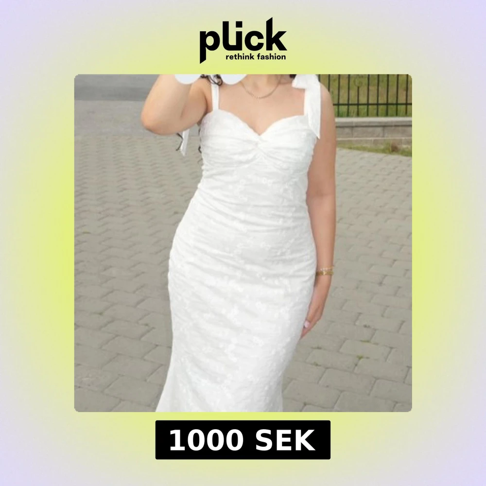 Supersnygg vit klänning med smala axelband som knyts i rosetter. Klänningen har figurnära passform och är täckt av ett blommigt spetsmönster. Perfekt till student, examen eller sommarens alla tillfällen! Använd 1 gång till studentmottagning. Originalpris är 1600kr från adoore.