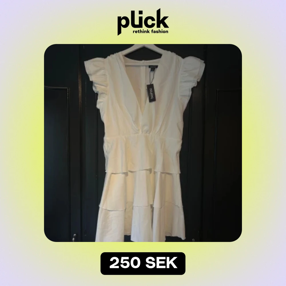 Helt oanvänd och ny klänning från Boohoo, lappen kvar! Jättefin och passar perfekt till student/skolavslutning. Råkade beställa i fel storlek, därav säljer jag den🩷