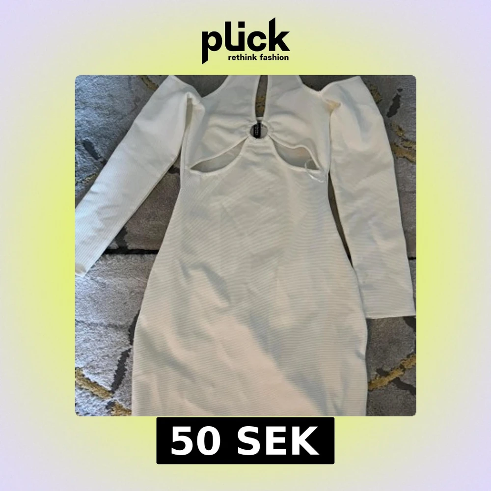 Elegant vit klänning som är långärmad. Klänningen har en unik detalj framtill med en ring och utskärningar som ger en modern touch. Perfekt för speciella tillfällen.