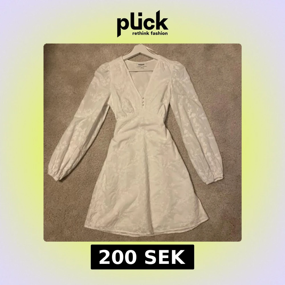 Elegant vit klänning med v-ringning och långa ärmar. Klänningen har ett subtilt blommigt mönster och dekorativa knappar framtill. Perfekt för en stilren look. Klänningen är endast använd en gång!❤️