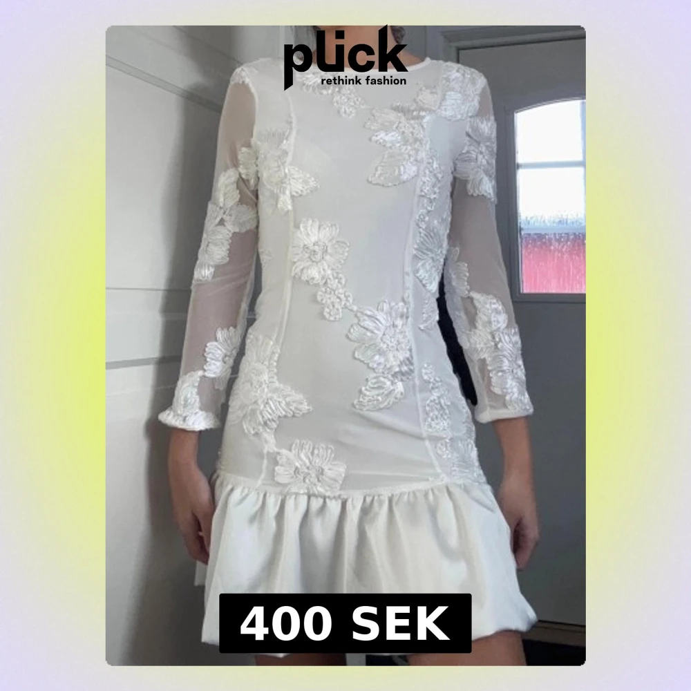 Snygg vit kortklänning med transparenta långärmar och vackra applikationer i blommigt mönster. Klänningen har volang nedtill och en feminin, figurnära passform. Perfekt för student. Aldrig använd men har tyvärr inte prislappen kvar