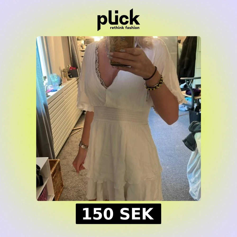 Supersöt vit kortklänning från Amisu med v-ringning och spetsdetalj vid urringningen. Klänningen har korta, vida ärmar och markerad midja med smock. Volangig kjol ger en flowy känsla, perfekt för sommarens alla tillfällen.
