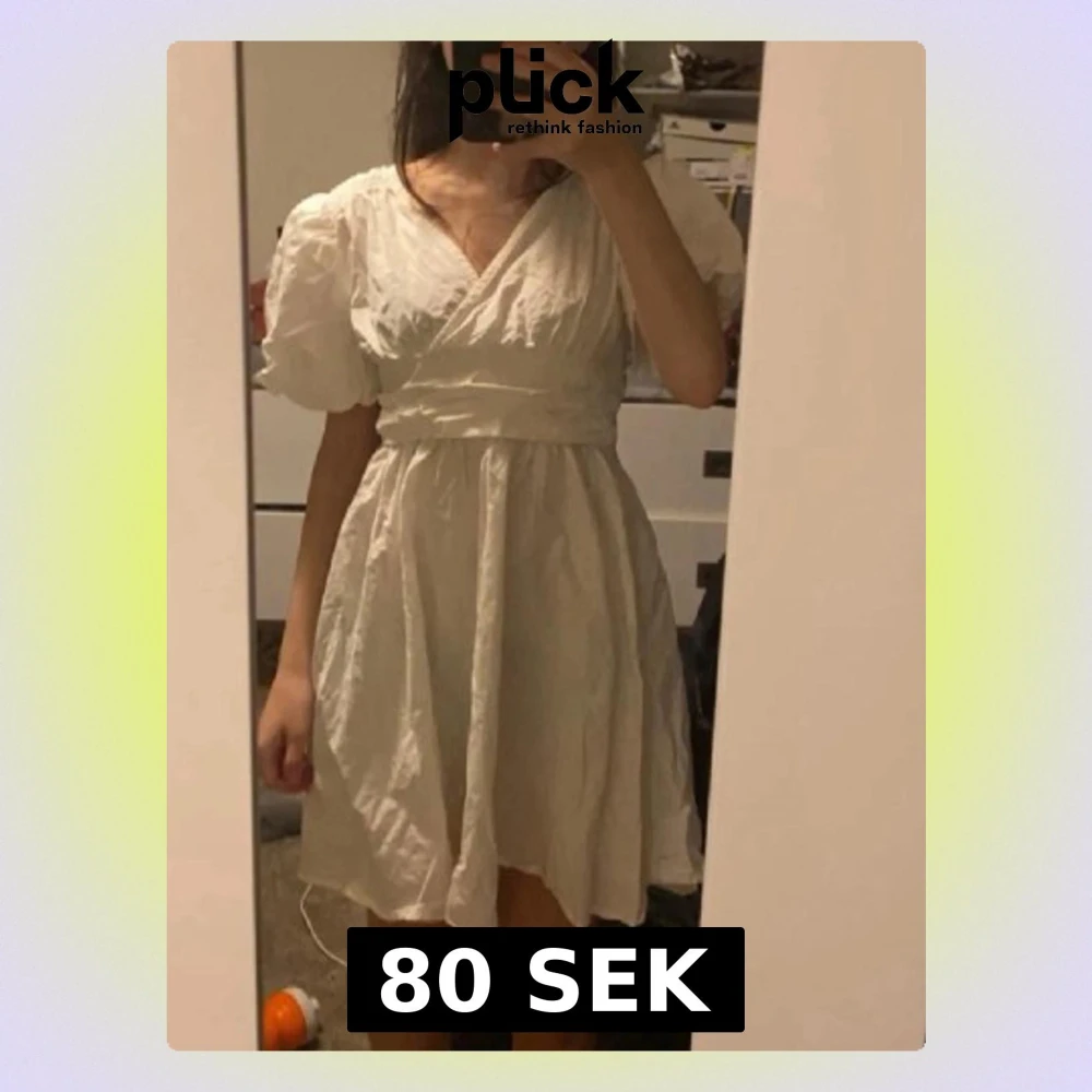 Säljer en söt vit kortklänning med omlottdesign och puffiga kortärmar. Klänningen har markerad midja.