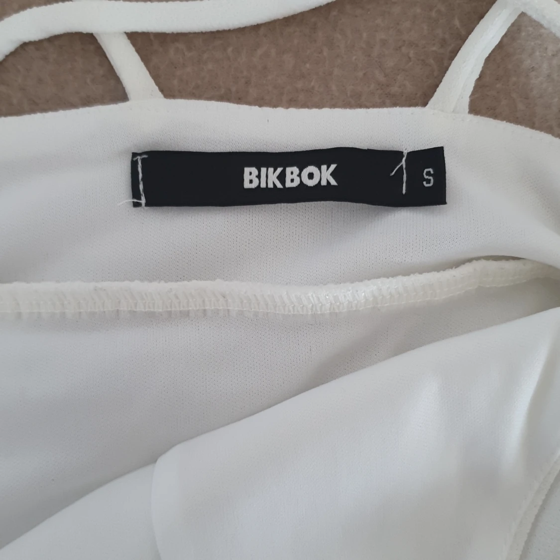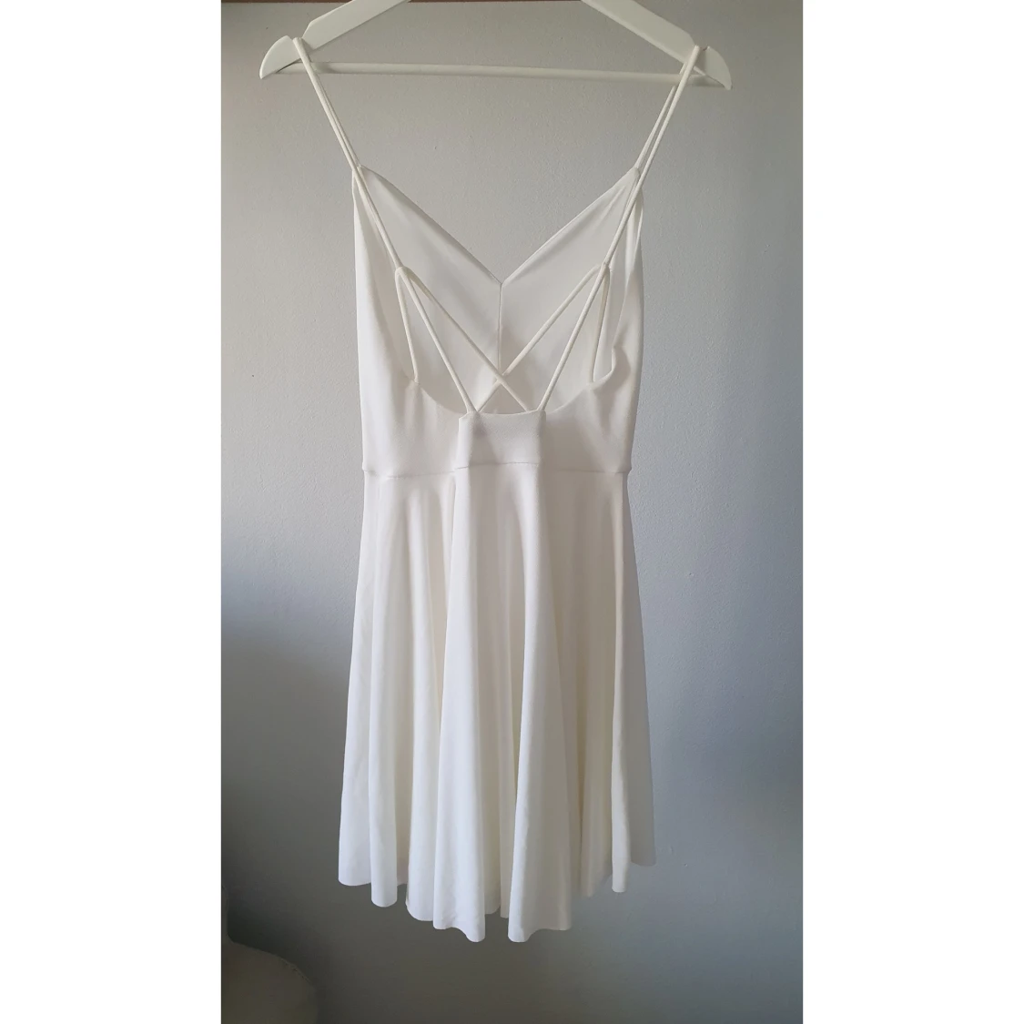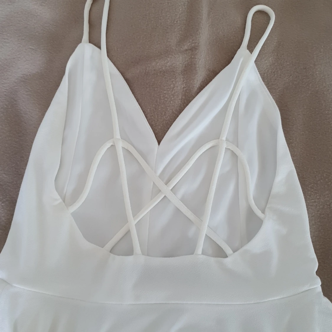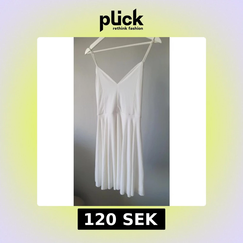 Säljer en stilren vit klänning från BikBok med smala axelband och en v-ringad design. Klänningen har en elegant öppen rygg med korsade banddetaljer. Perfekt till student, skolavslutning, examen eller bara sommarens fina dagar! 🤍