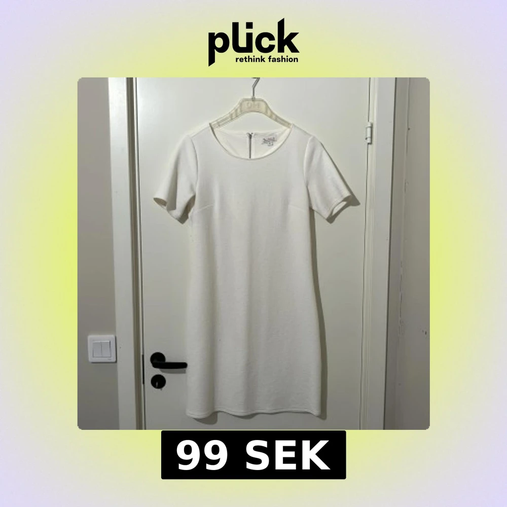 Snygg vit klänning från Bondelid i storlek S. Den har en enkel och stilren design med korta ärmar och dragkedja bak. Perfekt för en elegant look.