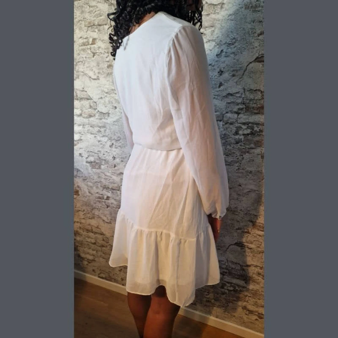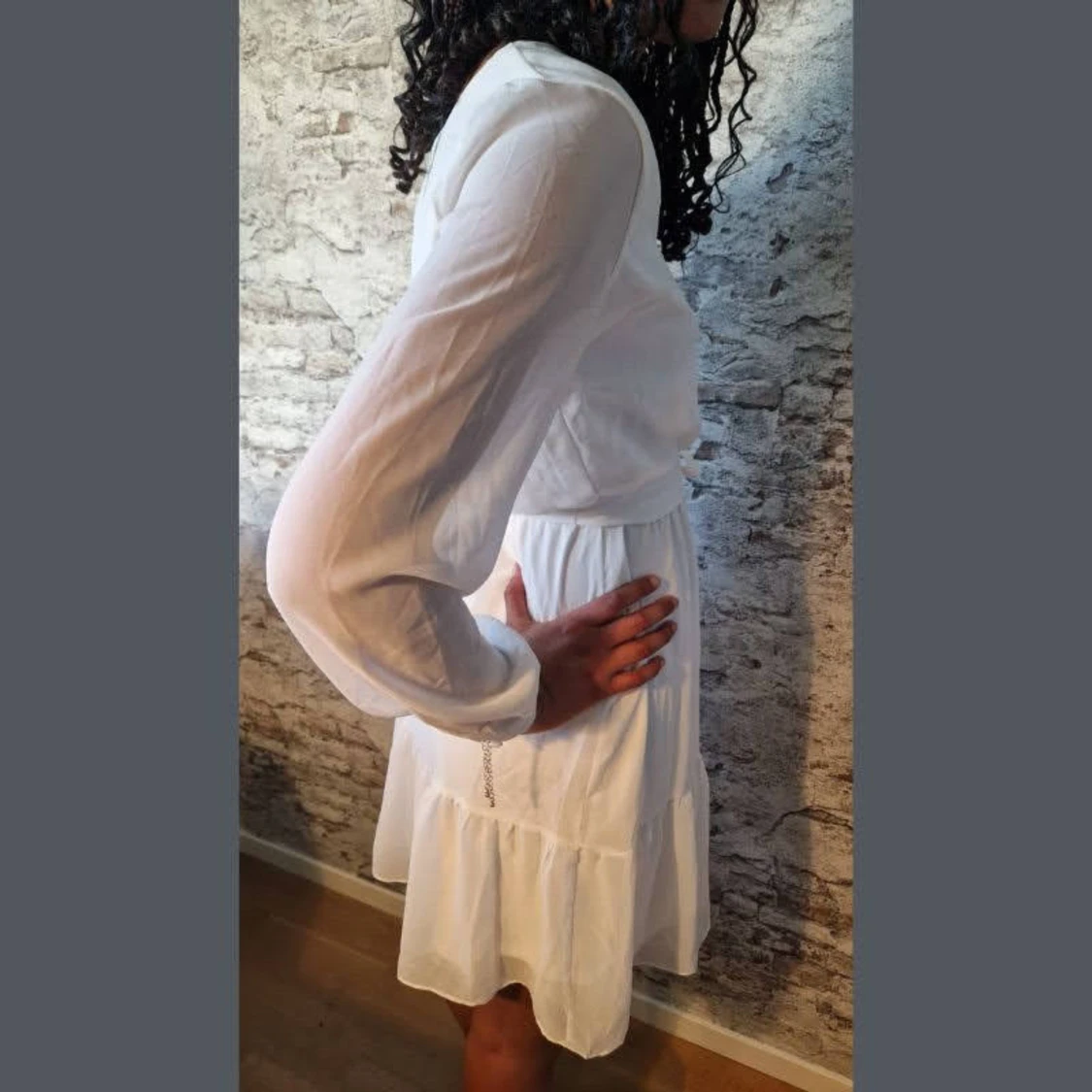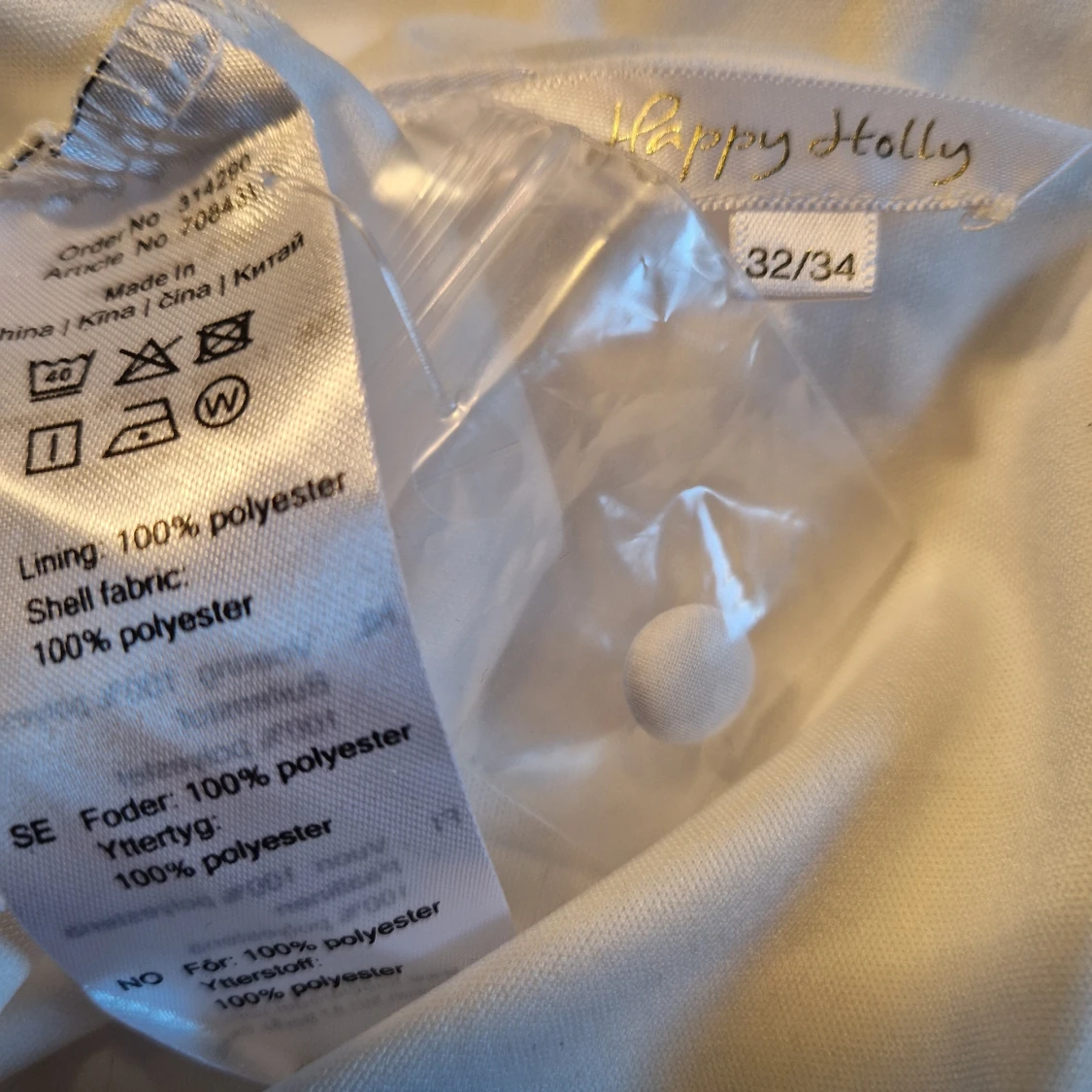 Vit klänning från Happy Holly. Lätt med transparenta ärmar. Använd 1 gång. Fodrad i livet och kjolen.