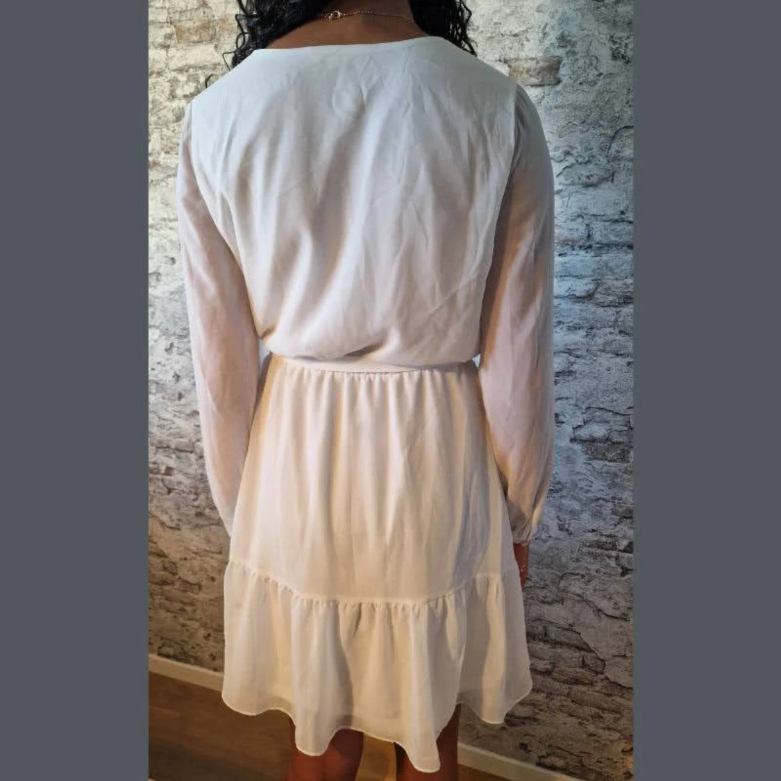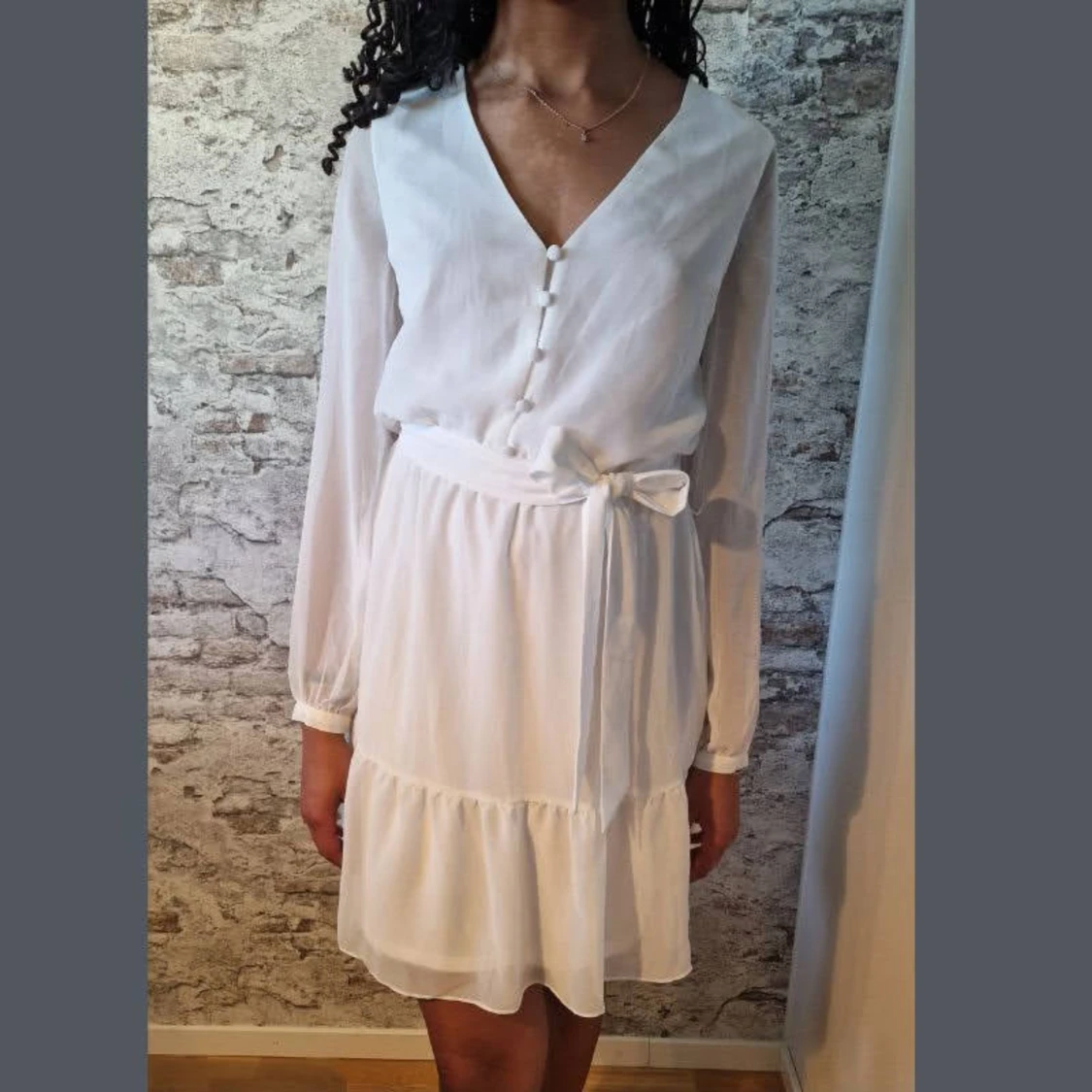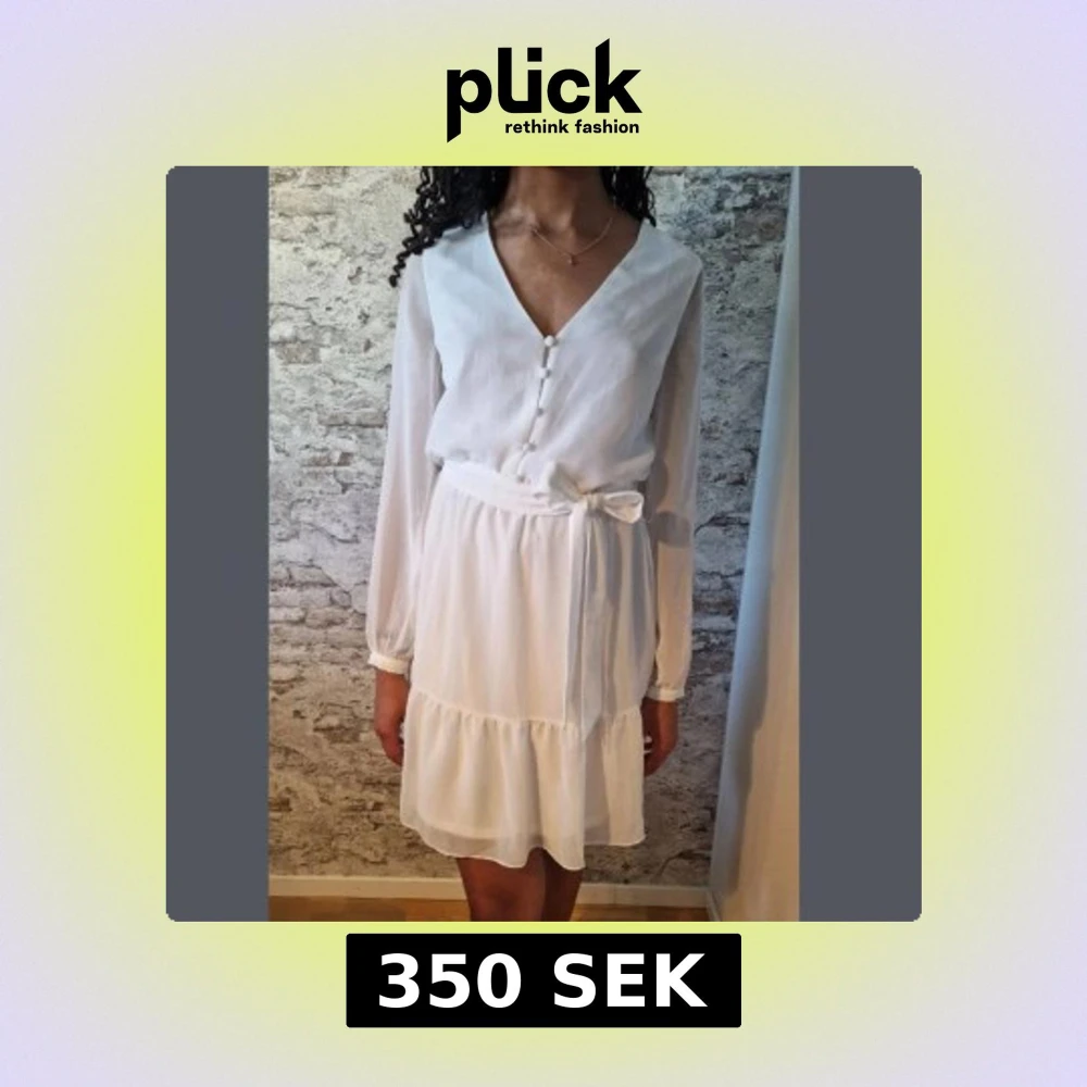 Vit klänning från Happy Holly. Lätt med transparenta ärmar. Använd 1 gång. Fodrad i livet och kjolen.