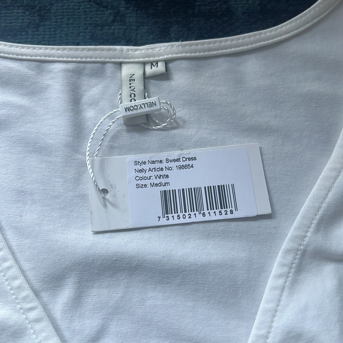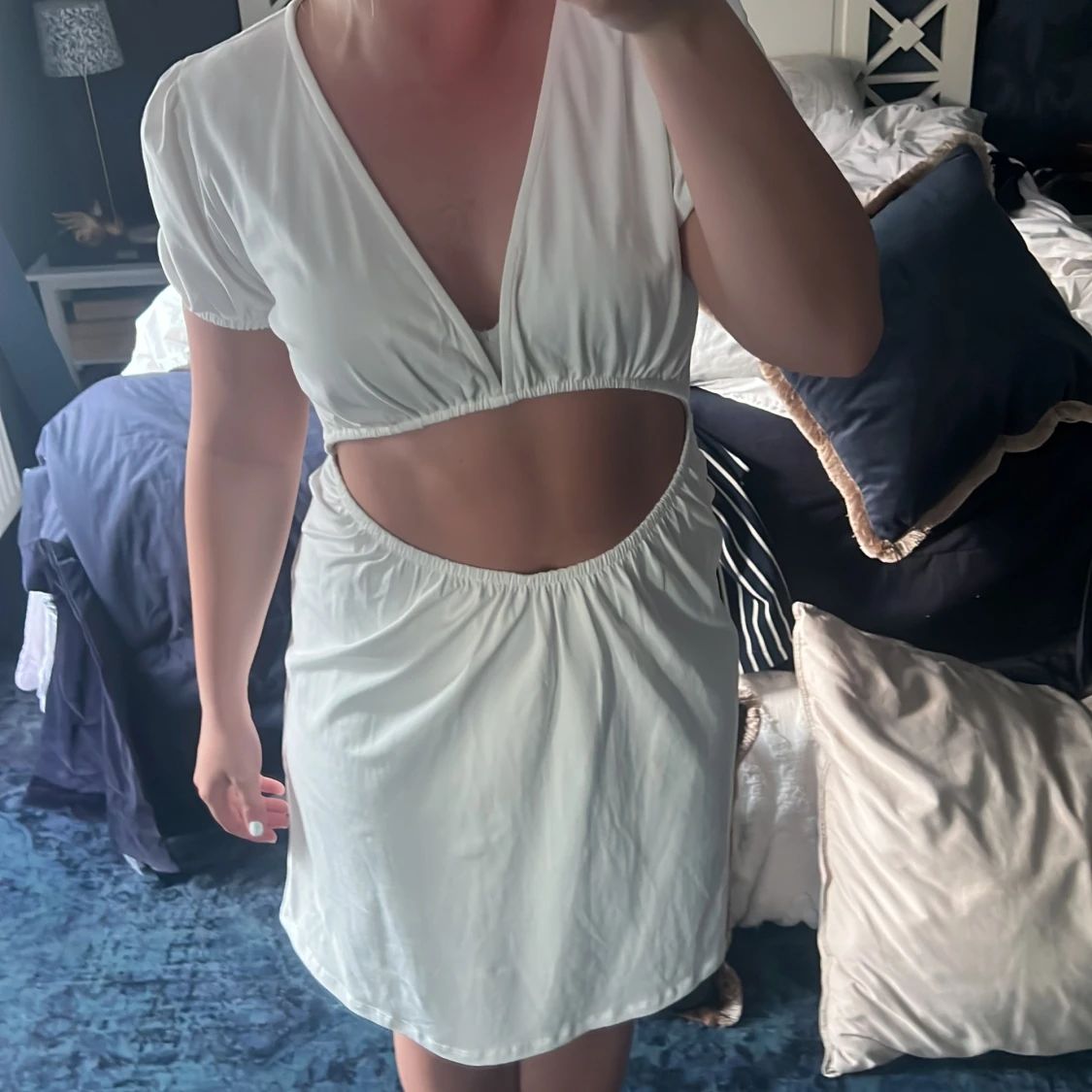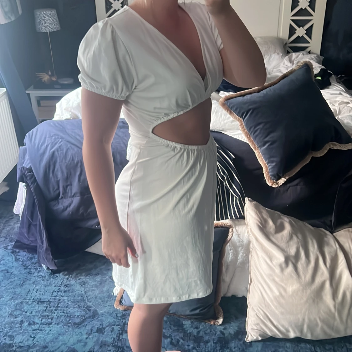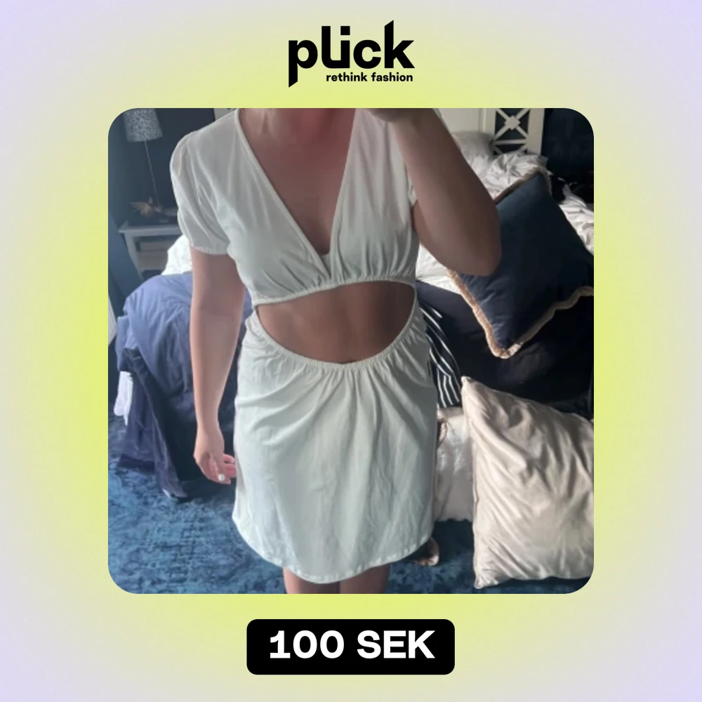 Vit klänning med ”håldetalj” på magen, köpt förra sommaren och aldrig använd. Passade inte mig personligen men tycker ändå att den är väldigt charmig.