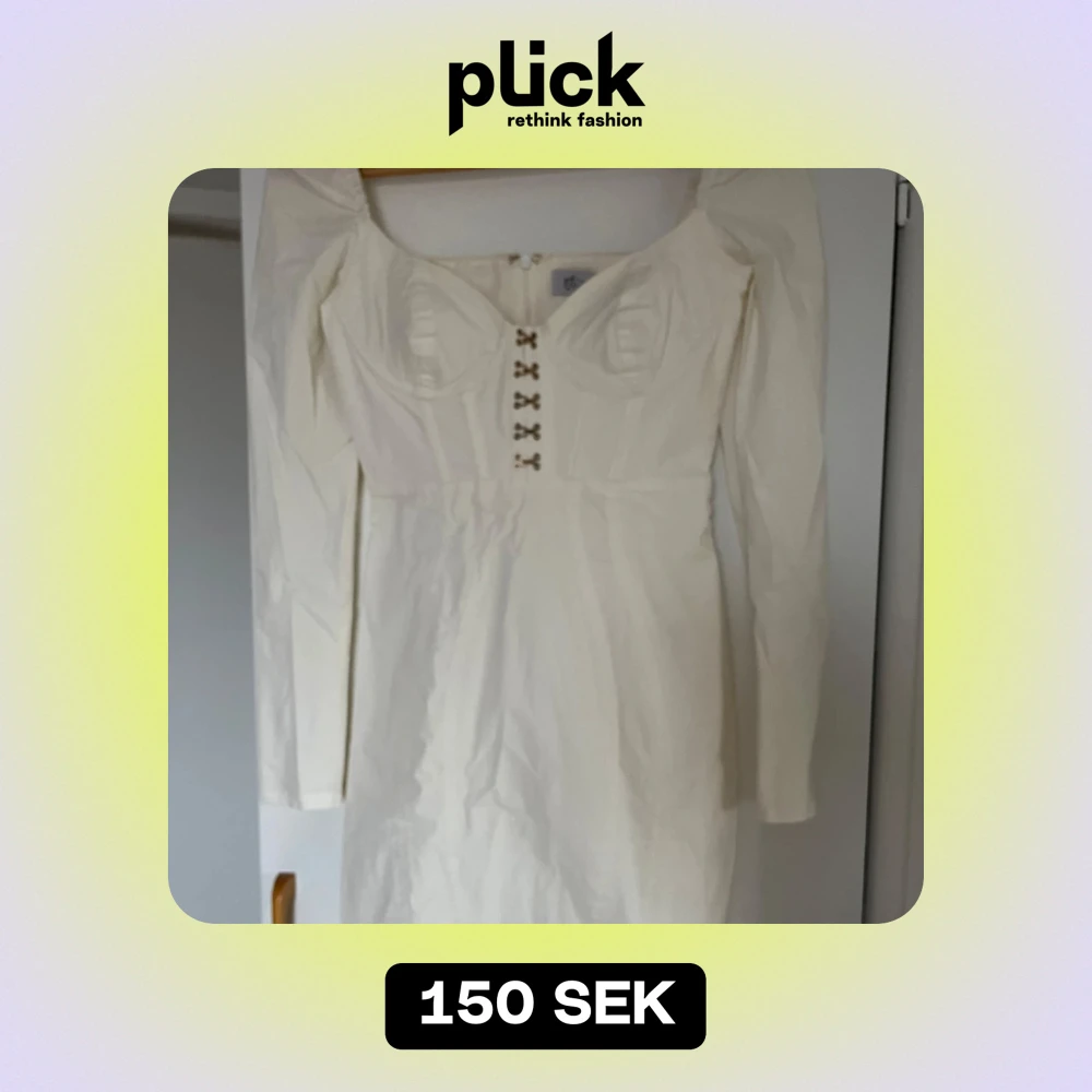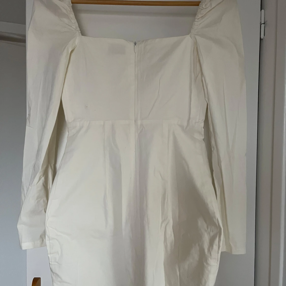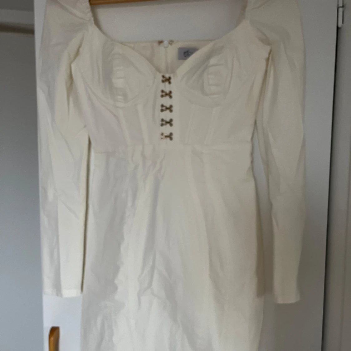 Säljer en elegant vit klänning med långärmad design och snygg snörning framtill. Perfekt för festliga tillfällen. Klänningen har en figurnära passform och är gjord i ett bekvämt material. Den har en dragkedja baktill för enkel påklädning.