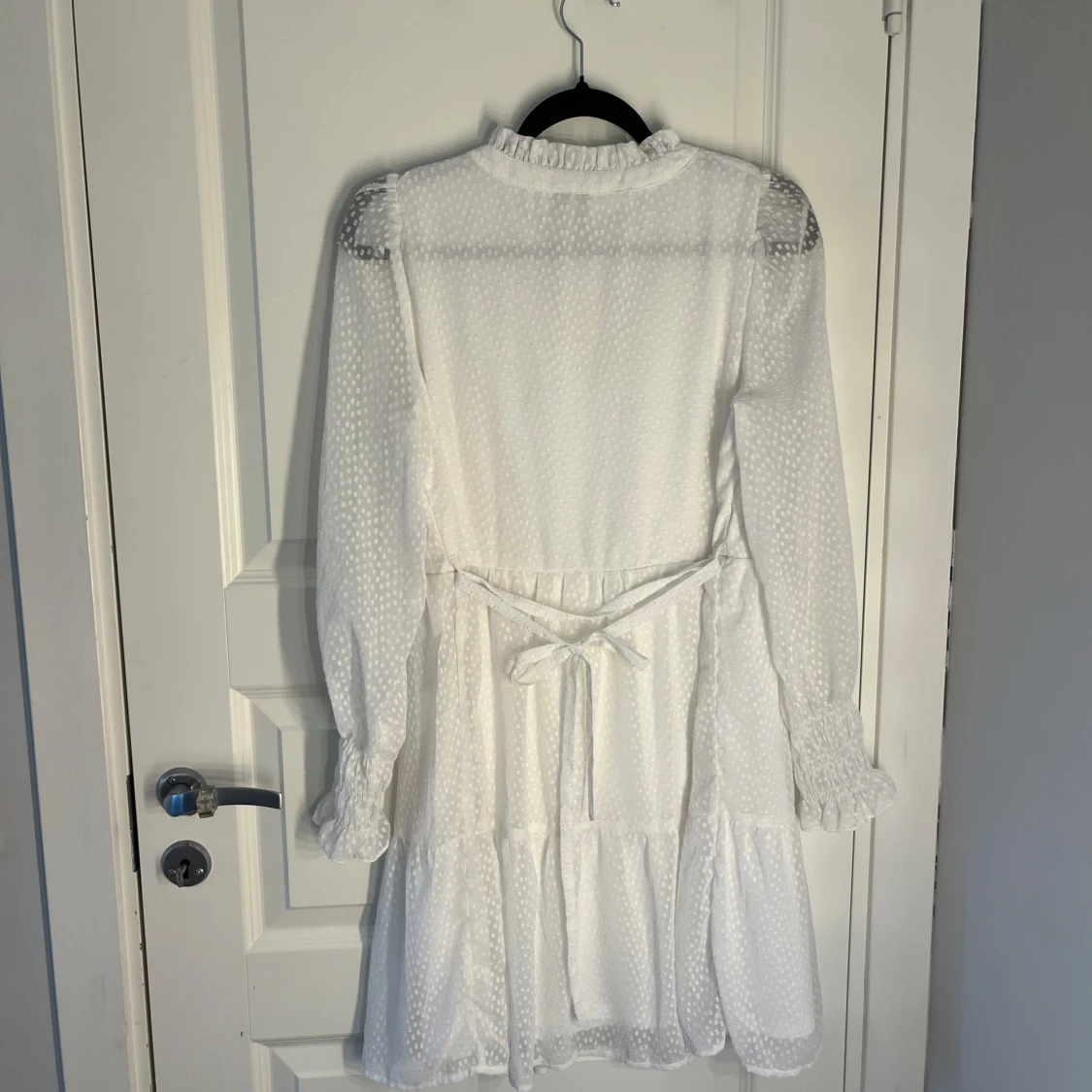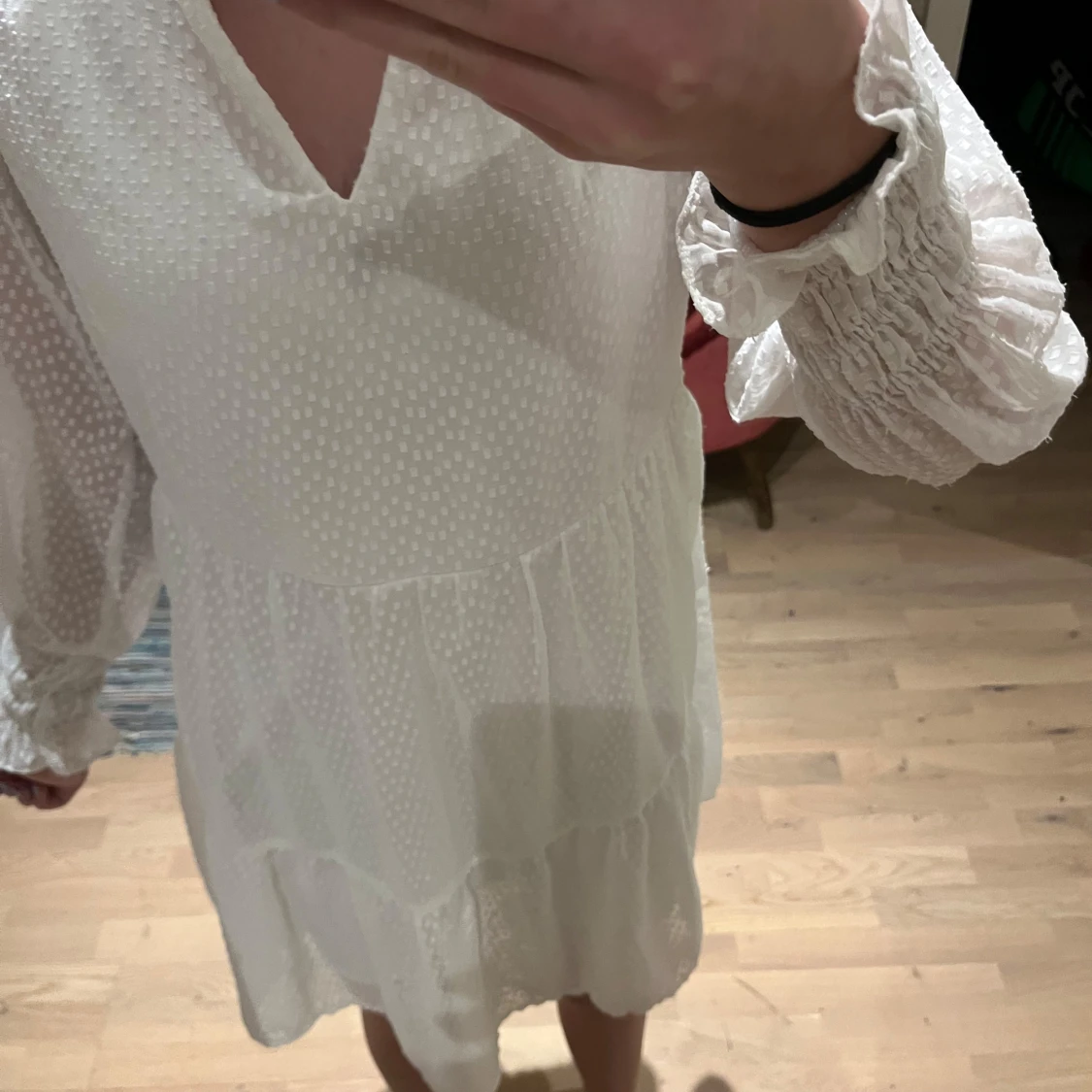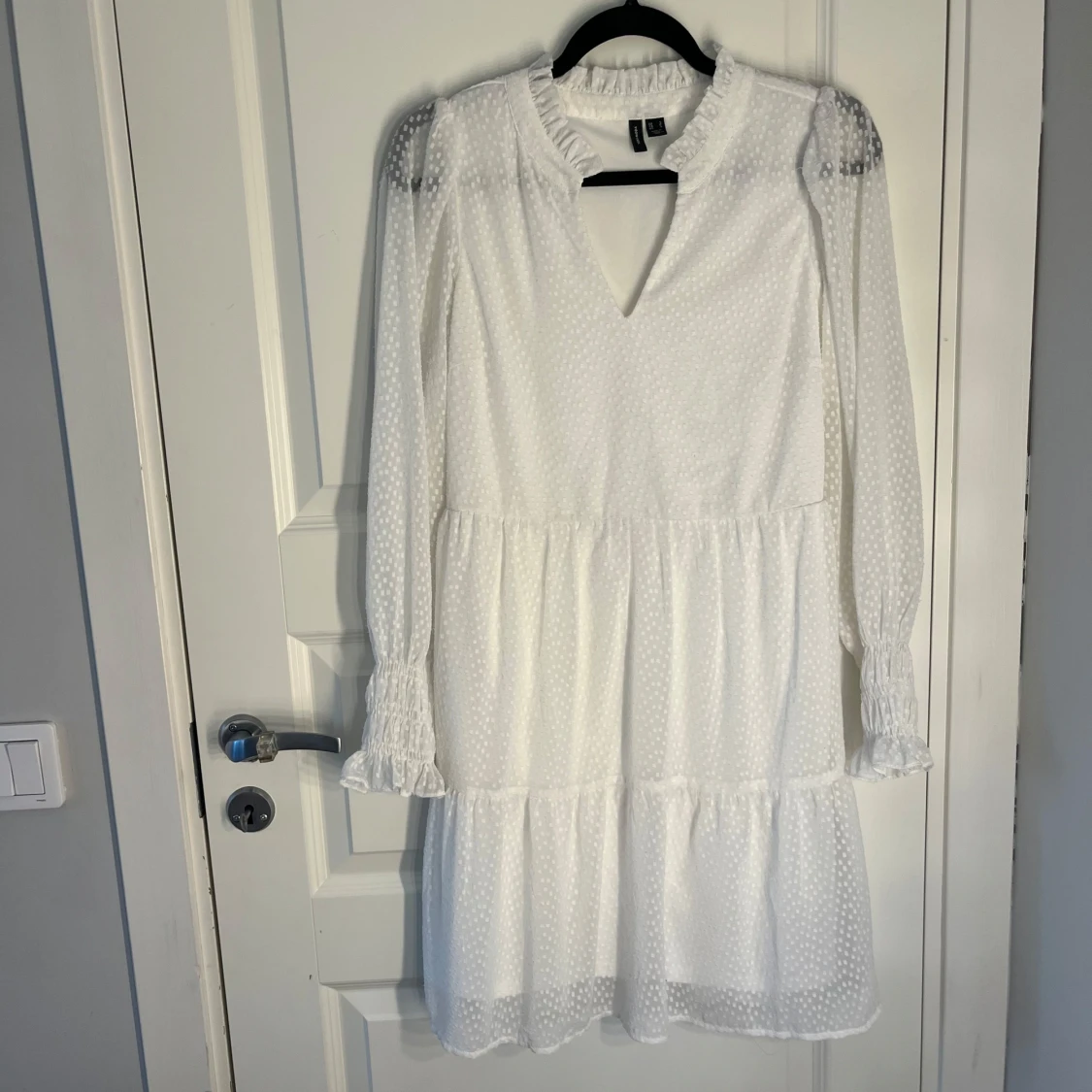 Säljer en söt vit klänning från Vero Moda med långärmad design och v-ringning. Klänningen har ett diskret prickigt mönster och volangdetaljer vid ärmslut och nederkant. Perfekt för en somrig look! 💫