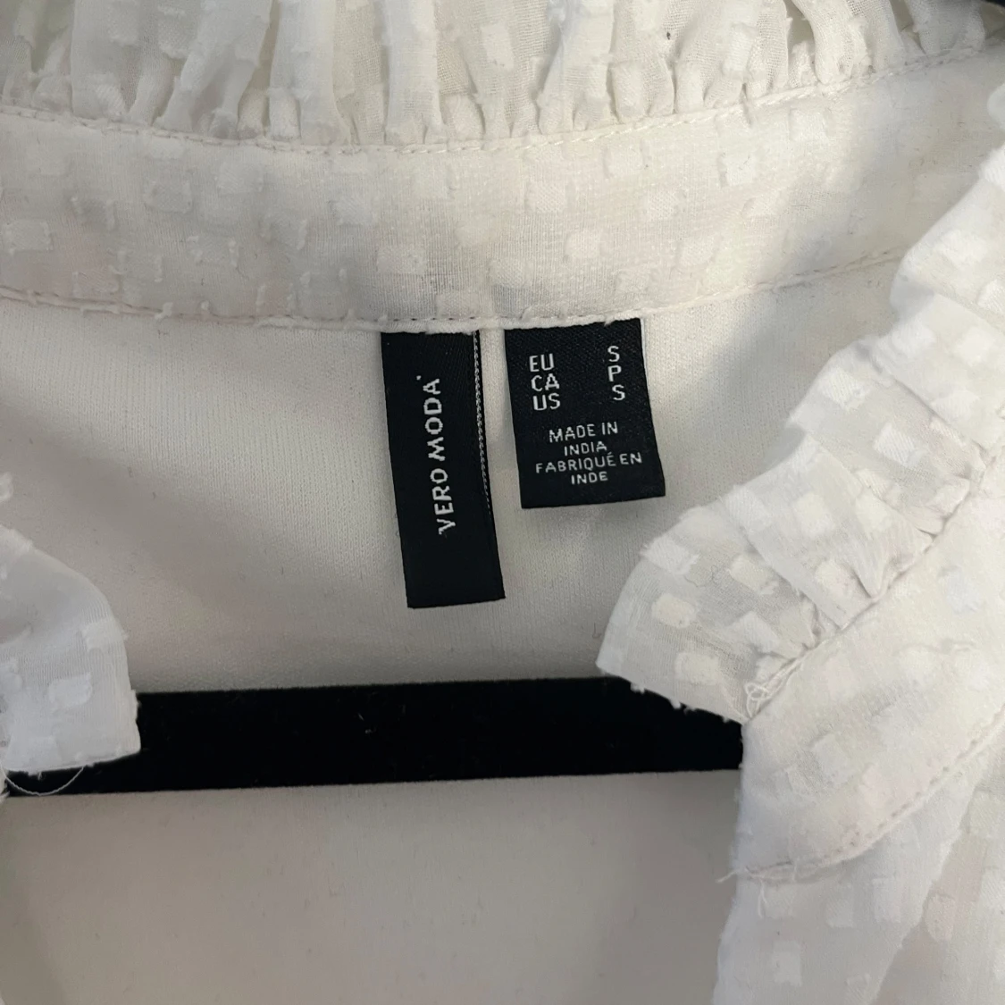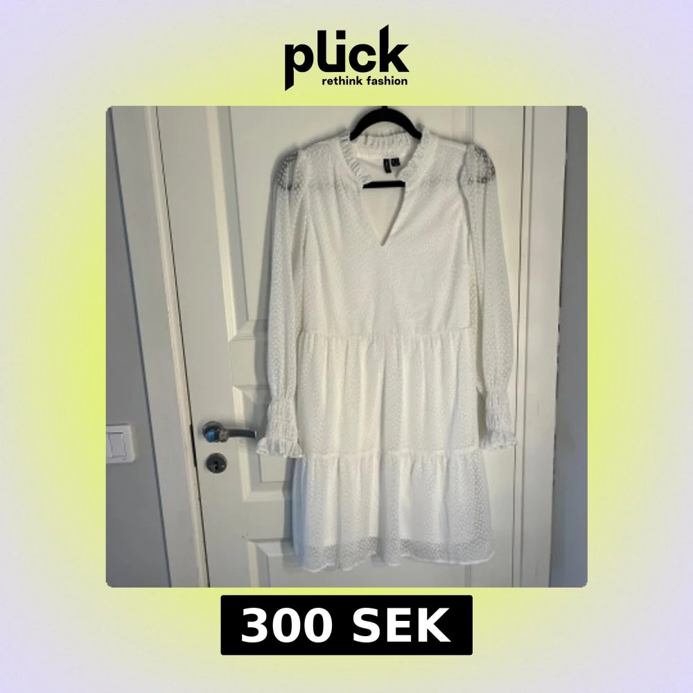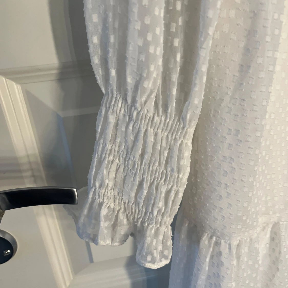 Säljer en söt vit klänning från Vero Moda med långärmad design och v-ringning. Klänningen har ett diskret prickigt mönster och volangdetaljer vid ärmslut och nederkant. Perfekt för en somrig look! 💫