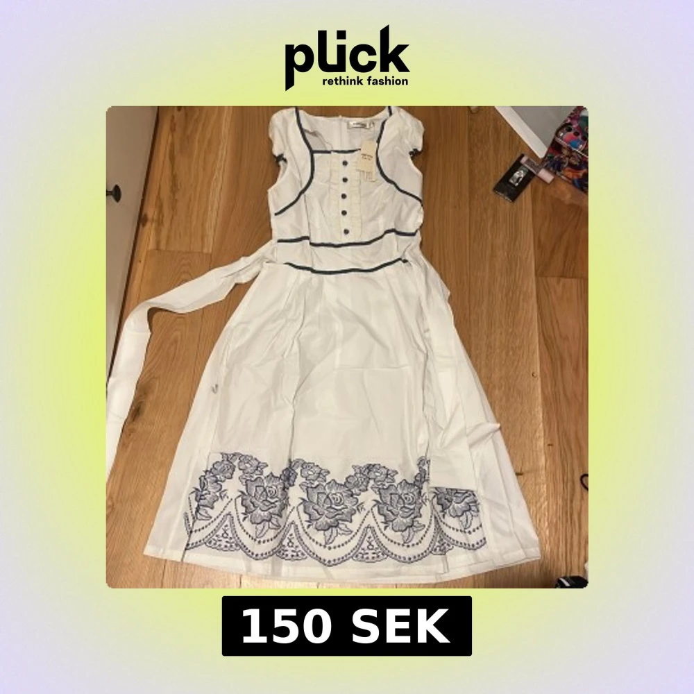 Charmig vit klänning med blå broderade blommor längs fållen och dekorativa knappar framtill. Klänningen har en knytning i midjan och är ärmlös med blå detaljer längs kanterna. Perfekt för en somrig look!