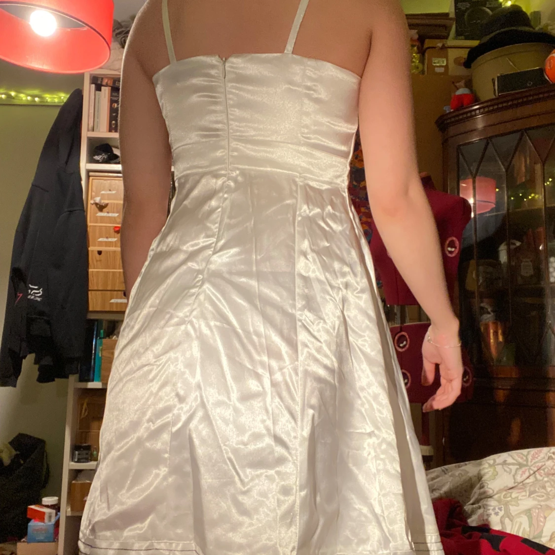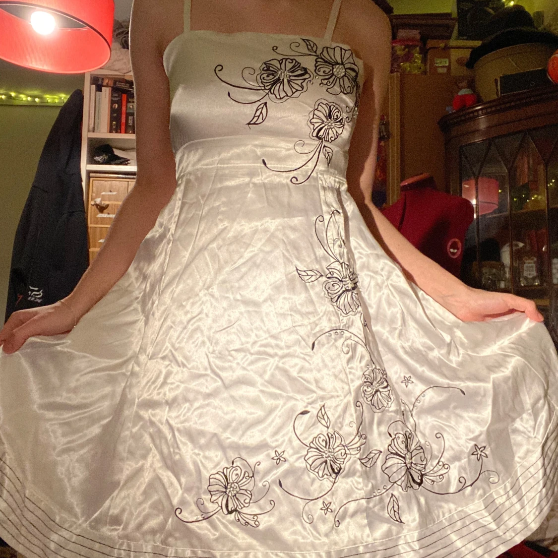 vit klänning från Kappahl med svart blommigt mönster och lite paljetter. har smala axelband och dragkedja baktill. ganska liten i bysten.