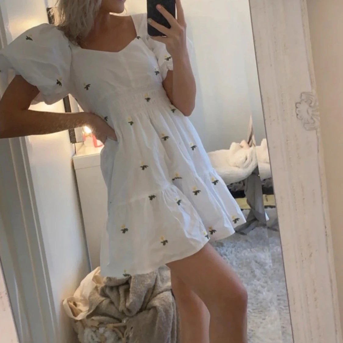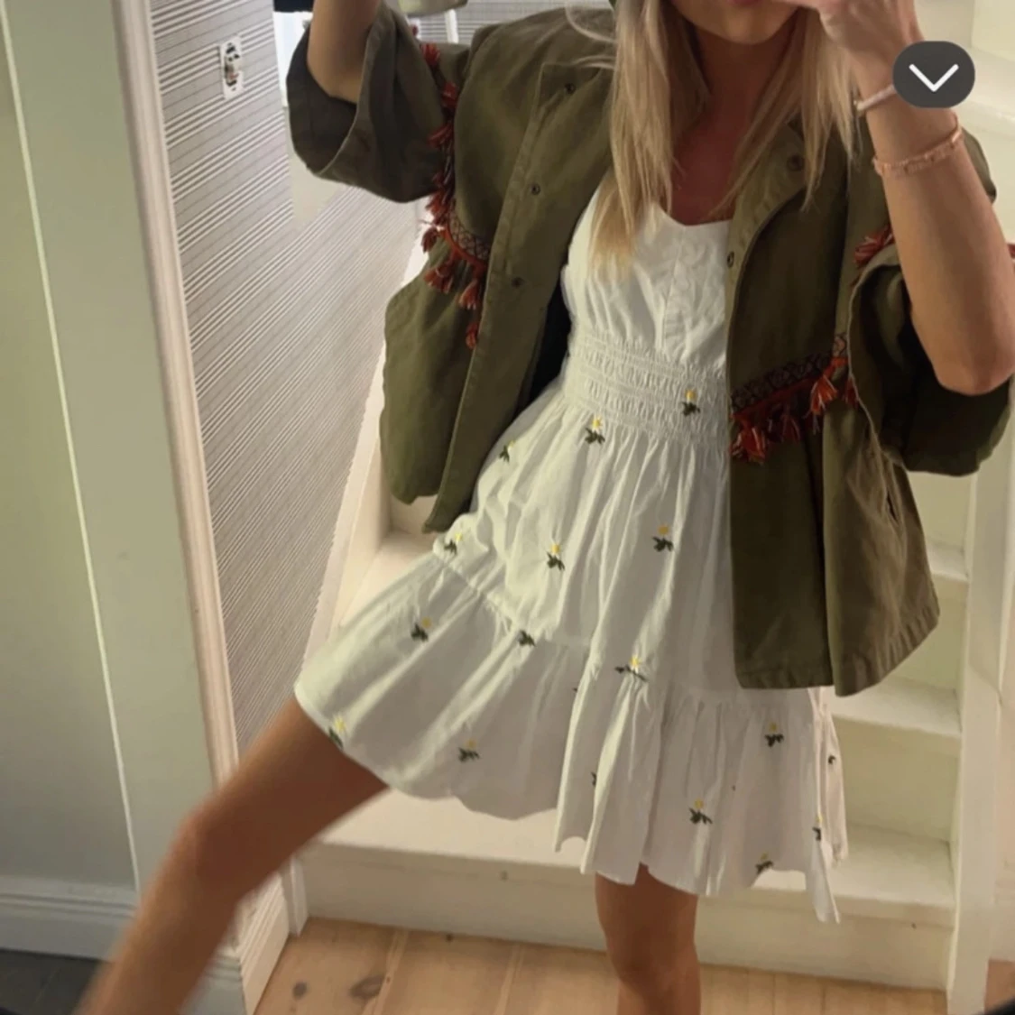 Vit klänning med gula blommor, köpte på plick men aldrig använt och är i mycket fint skick!