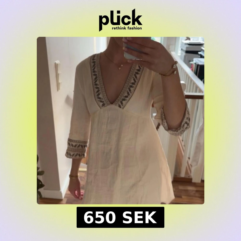 Charmig klänning med v-ringad hals och broderade detaljer i mörkare toner. Klänningen har trekvartsärmar med matchande broderi vid ärmslut. Perfekt för en avslappnad sommarlook.