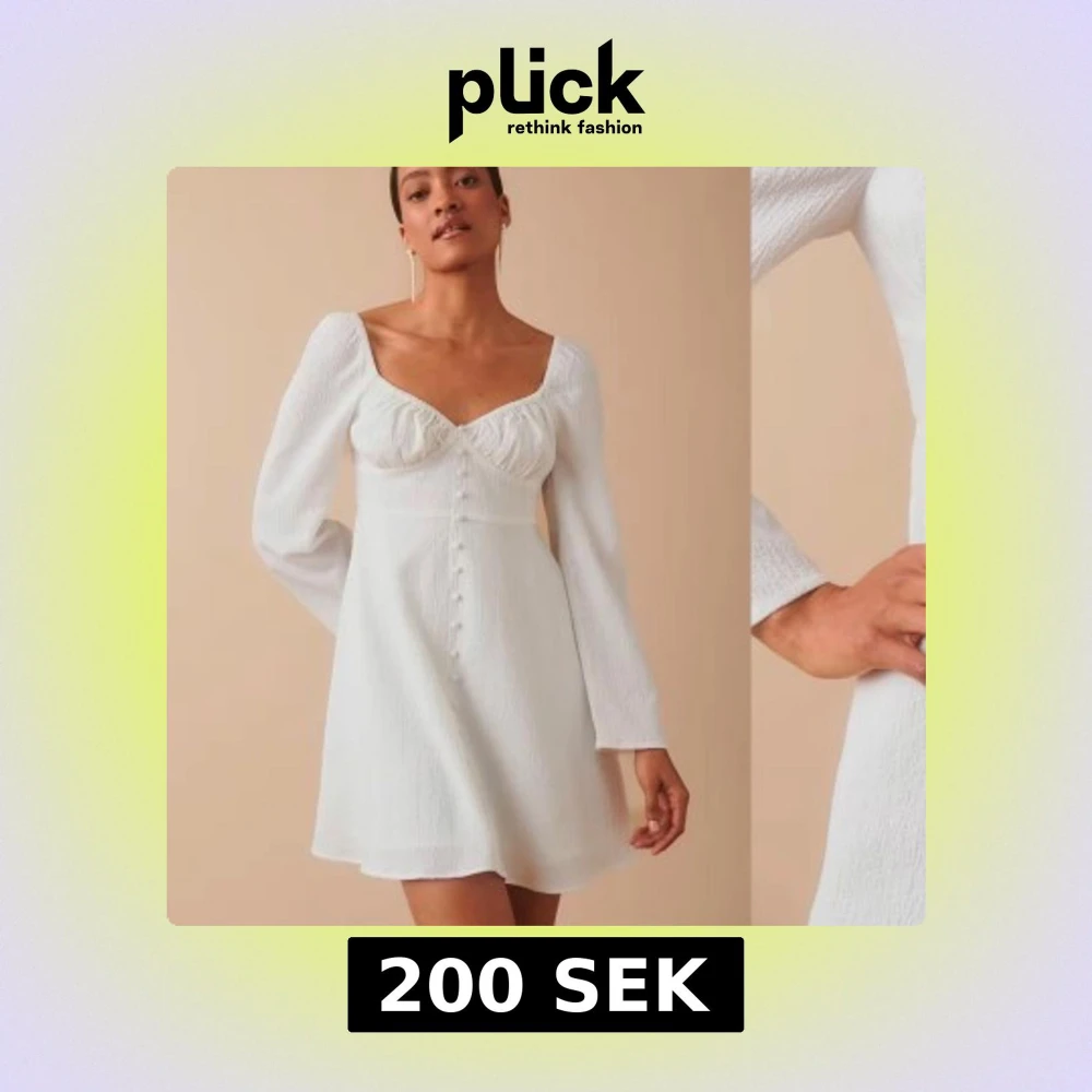 Elegant vit klänning med v-ringning och långa ärmar. Klänningen har knappar framtill och passar perfekt inför studenten, aldrig använd och alla lappar kvar!