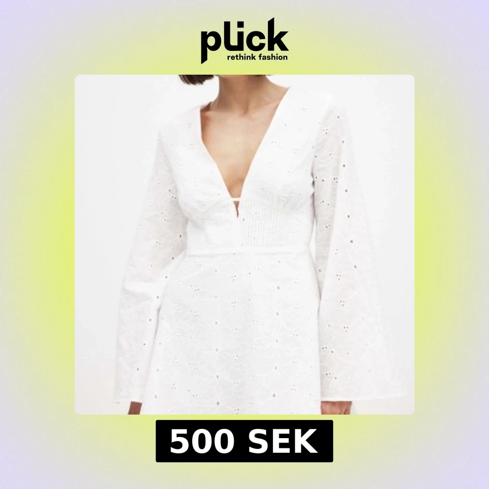 Superfin vit klänning från NA-KD med broderat blommönster, djup v-ringning och lång ärm. Klänningen har en snygg öppen rygg och markerad midja. Perfekt till sommaren och student