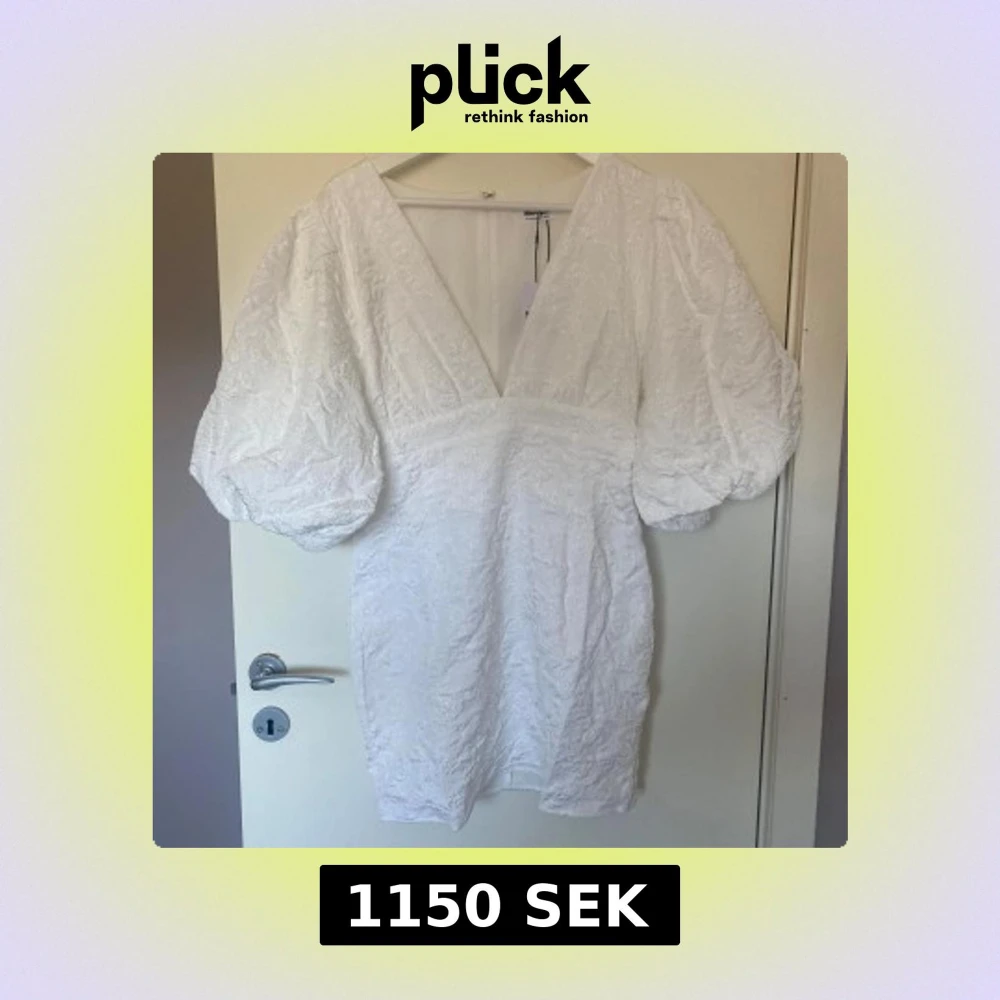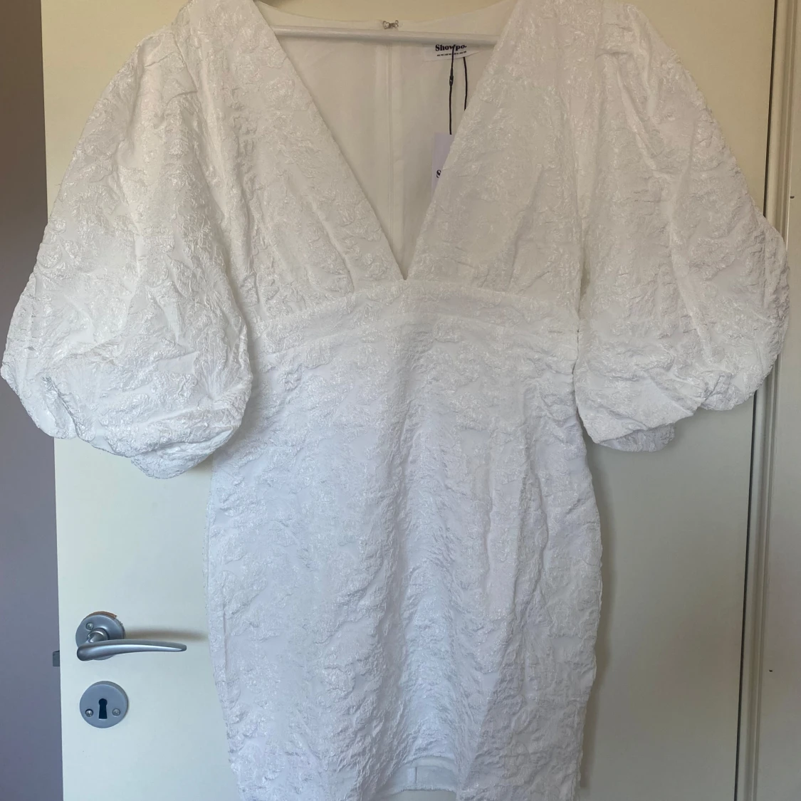 Säljer en ursnygg studentklänning/vit klänning med djup v-ringning och puffiga ärmar. Alldeles ny, från Showpo med prislapp kvar. Finns i storlek 38/M men även 36/S, normal i storlek.