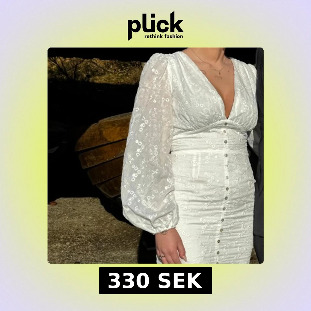 Superfin vit klänning med v-ringning, puffiga långärmar och dekorativa knappar framtill. Klänningen har broderade blommor i tyget och markerad midja för en feminin siluett. Perfekt för sommarens tillfällen!