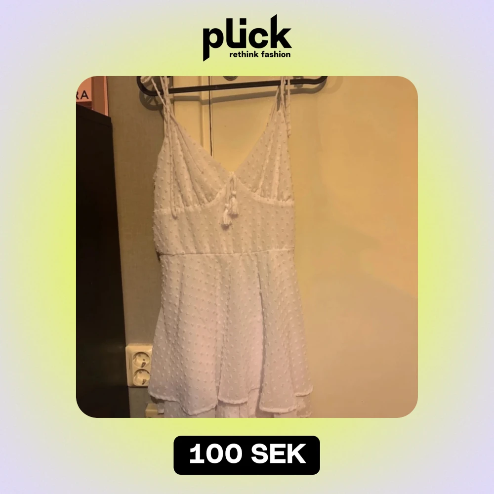 vit klänning med smala axelband. Klänningen har en v-ringad design och en luftig passform, perfekt för varma dagar men även kalla. Den har även en söt knytning framtill och en skitsnygg rygg. Helt ny