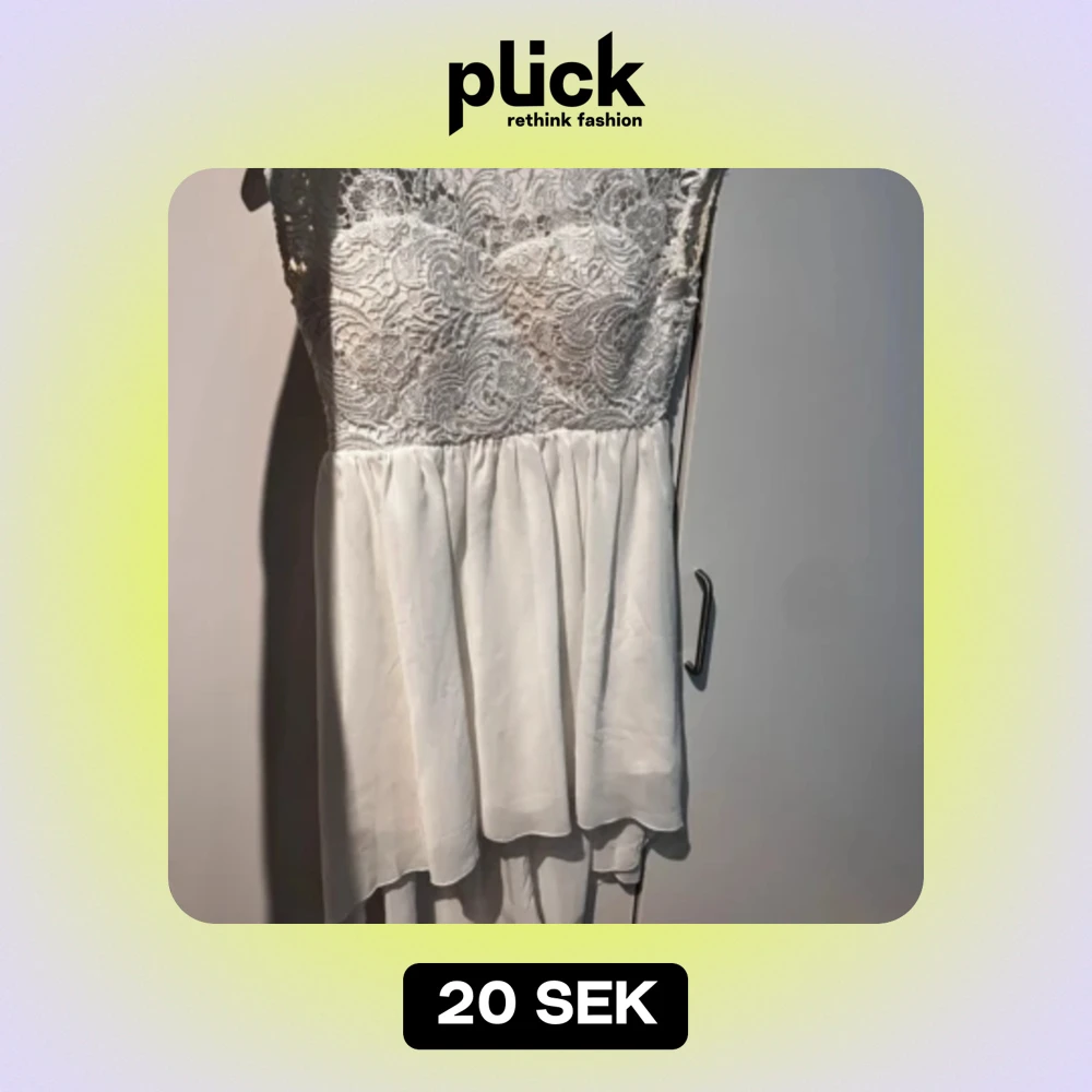 vit klänning med spets från nelly. lite längre baktill än fram. hel och fin, finns en liten fläck fram som jag inte provat att ta bort då ja inte använt klänningen på flera år. samt de är en fläck inuti av brun utan sol, men syns ej utifrån.