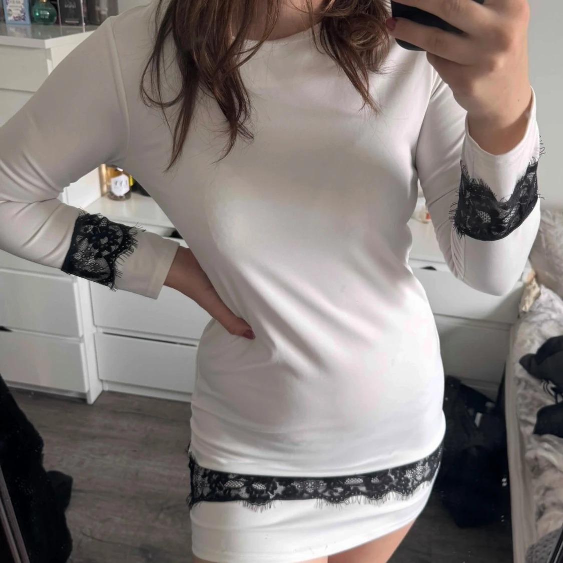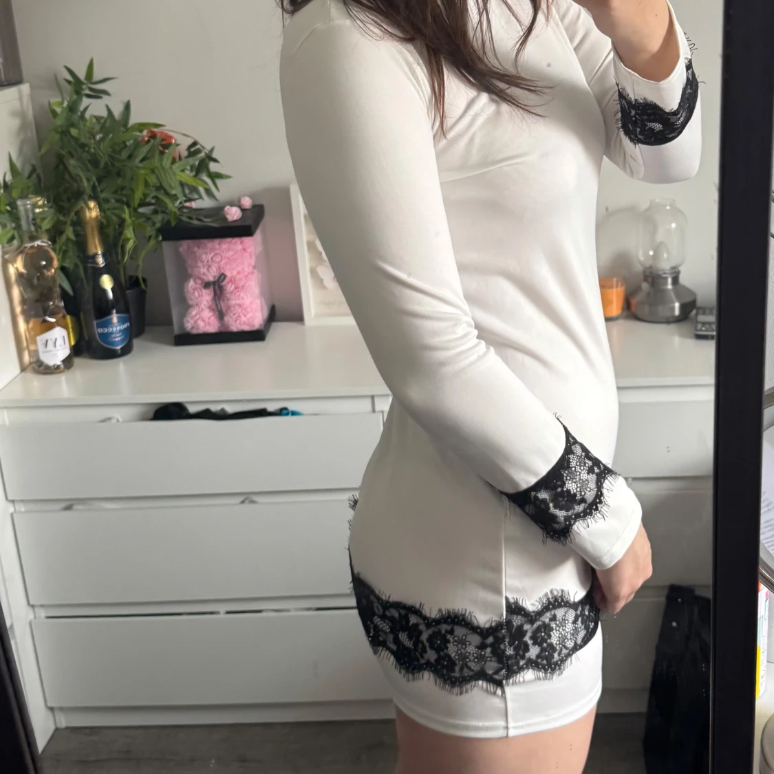 Snygg vit klänning med svarta spetsdetaljer vid ärmslut och nederkant. Klänningen har långa ärmar och en tight passform. (Katt och kanin finns i hemmet)