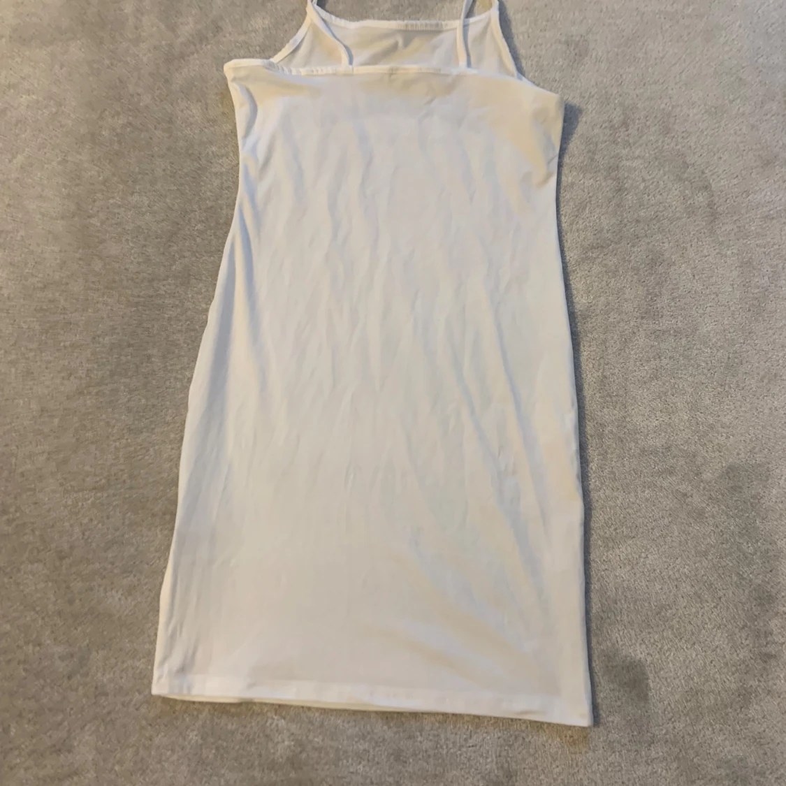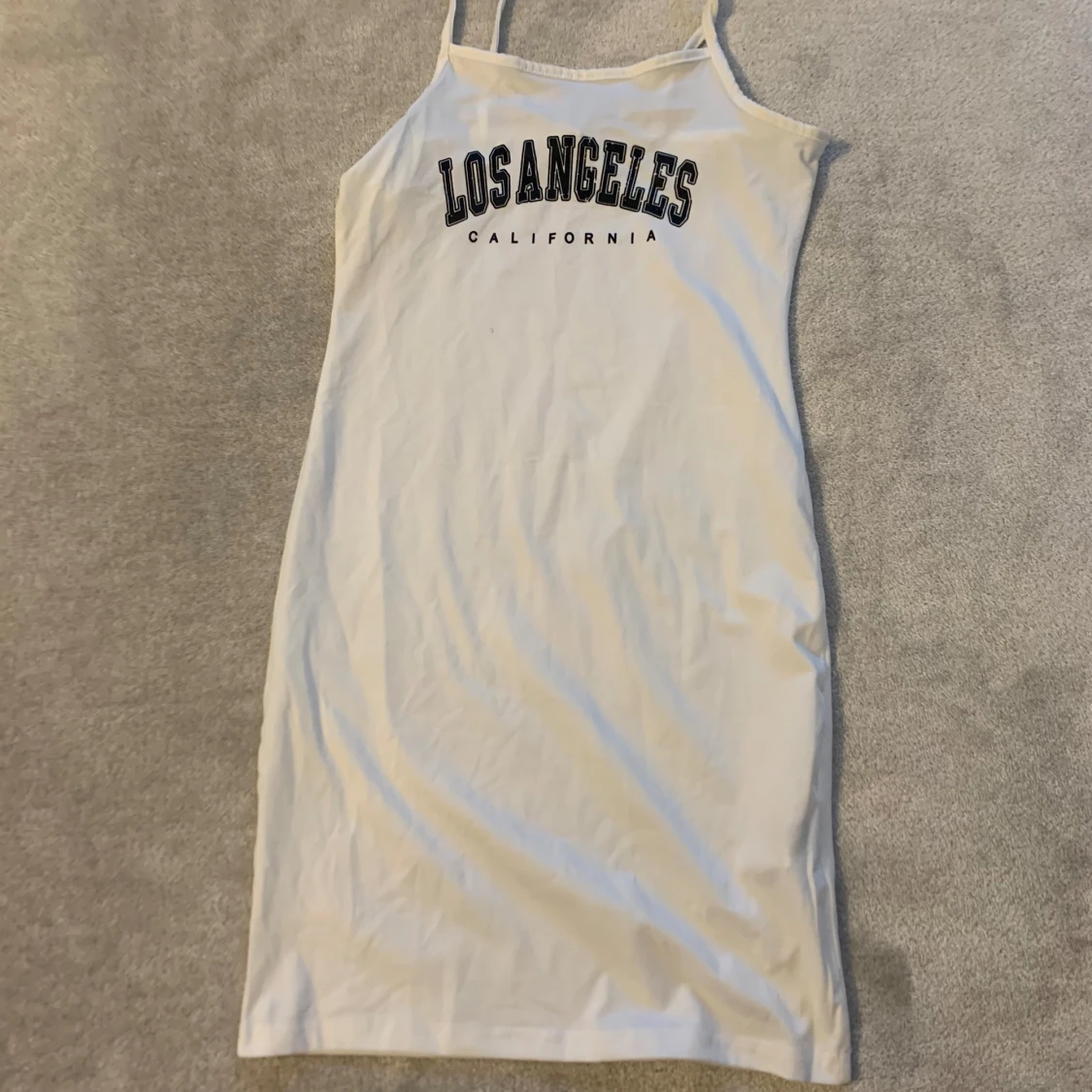 Snygg vit klänning med texten 'Los Angeles California' i svart på framsidan. Klänningen har smala axelband och en enkel design som passar perfekt för varma dagar.